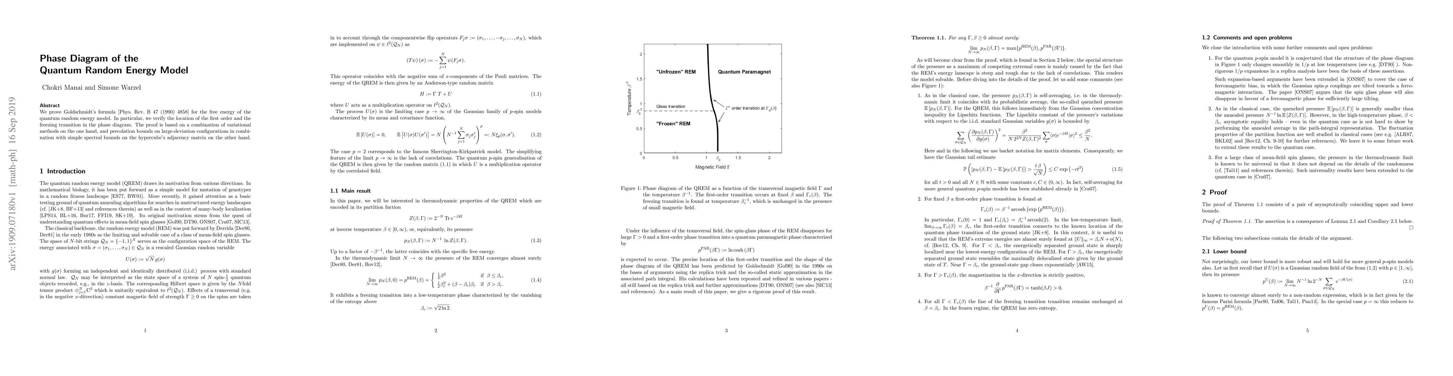 Researchers proved Goldschmidt's formula for the free energy of the quantum random energy model, verifying the location of its first-order and freezing transitions in the phase diagram using a combination of variational methods and percolation bounds.