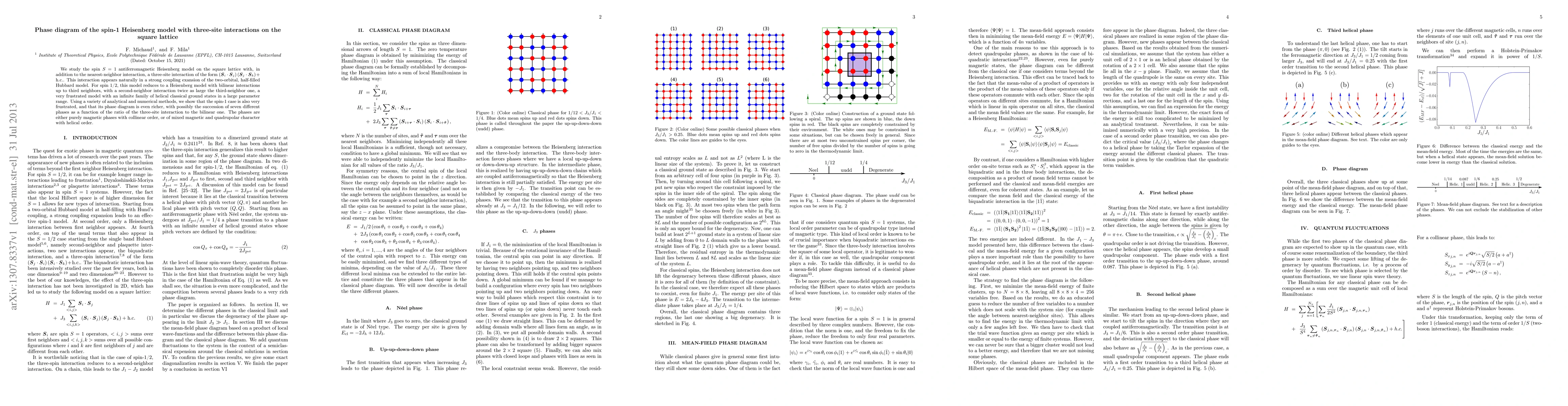 We study the spin S=1 antiferromagnetic Heisenberg model on the square lattice with, in addition to the nearest-neighbor interaction, a three-site interaction of the form (S_i S_j)*(S_j S_k) + h.c.. This interaction appears naturally in a strong coupling exansion of the two-orbital, half-filled Hubbard model. For spin 1/2, this model reduces to a Heisenberg model with bilinear interactions up to third neighbors, with a second-neighbor interaction twice as large the third-neighbor one, a very frustrated model with an infinite family of helical classical ground states in a large parameter range. Using a variety of analytical and numerical methods, we show that the spin-1 case is also very frustrated, and that its phase diagram is even richer, with possibly the succession of seven different phases as a function of the ratio of the three-site interaction to the bilinear one. The phases are either purely magnetic phases with collinear order, or of mixed magnetic and quadrupolar character with helical order.