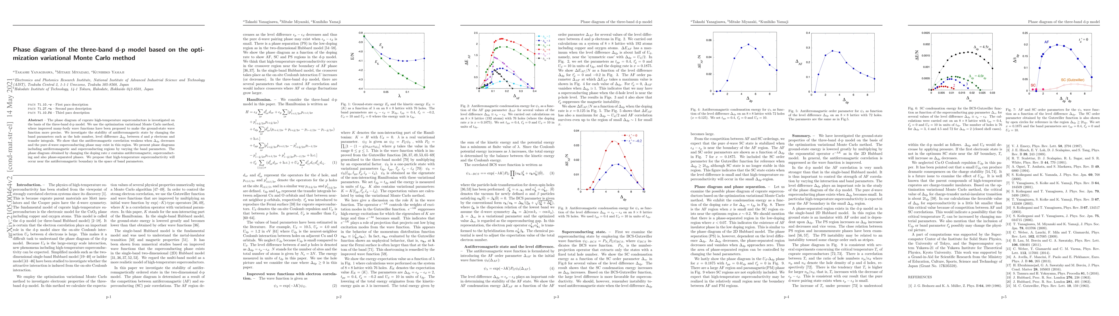The phase diagram of cuprate high-temperature superconductors is investigated on the basis of the three-band d-p model. We use the optimization variational Monte Carlo method, where improved many-body wave functions have been proposed to make the ground-state wave function more precise. We investigate the stability of antiferromagnetic state by changing the band parameters such as the hole number, level difference $\Delta_{dp}$ between $d$ and $p$ electrons and transfer integrals. We show that the antiferromagnetic correlation weakens when $\Delta_{dp}$ decreases and the pure $d$-wave superconducting phase may exist in this region. We present phase diagrams including antiferromagnetic and superconducting regions by varying the band parameters. The phase diagram obtained by changing the doping rate $x$ contains antiferromagnetic, superconducting and also phase-separated phases. We propose that high-temperature superconductivity will occur near the antiferromagnetic boundary in the space of band parameters.