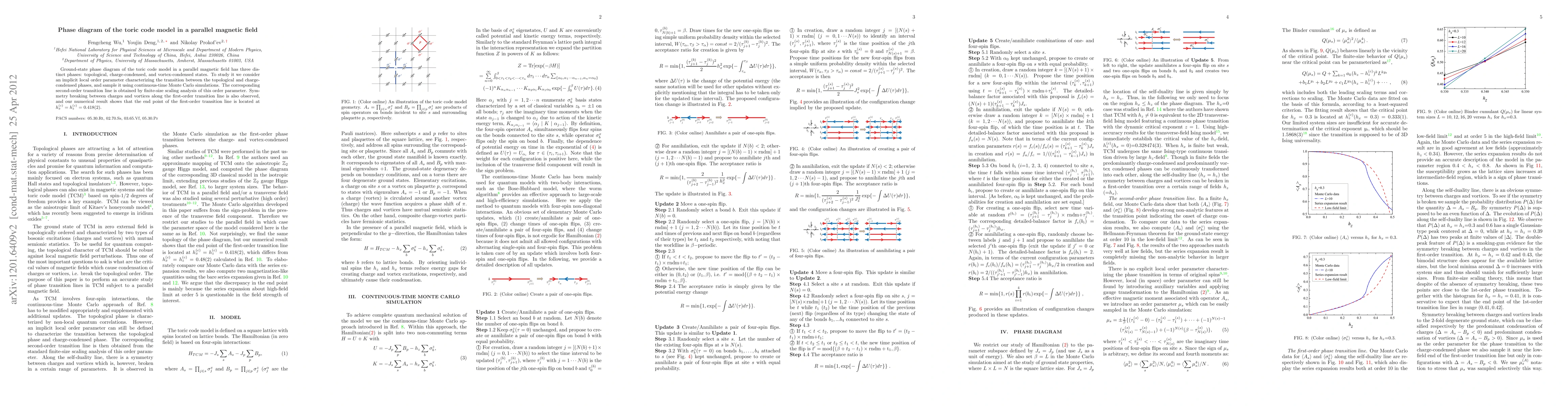 This paper investigates the phase diagram of the toric code model under a parallel magnetic field, identifying three phases: topological, charge-condensed, and vortex-condensed. The study employs Monte Carlo simulations to characterize the transition between topological and charge-condensed phases and uses finite-size scaling to determine the second-order transition line, while also observing symmetry breaking and locating the endpoint of the first-order transition at $h_x^{(c)}=h_z^{(c)}=0.418(2)$.