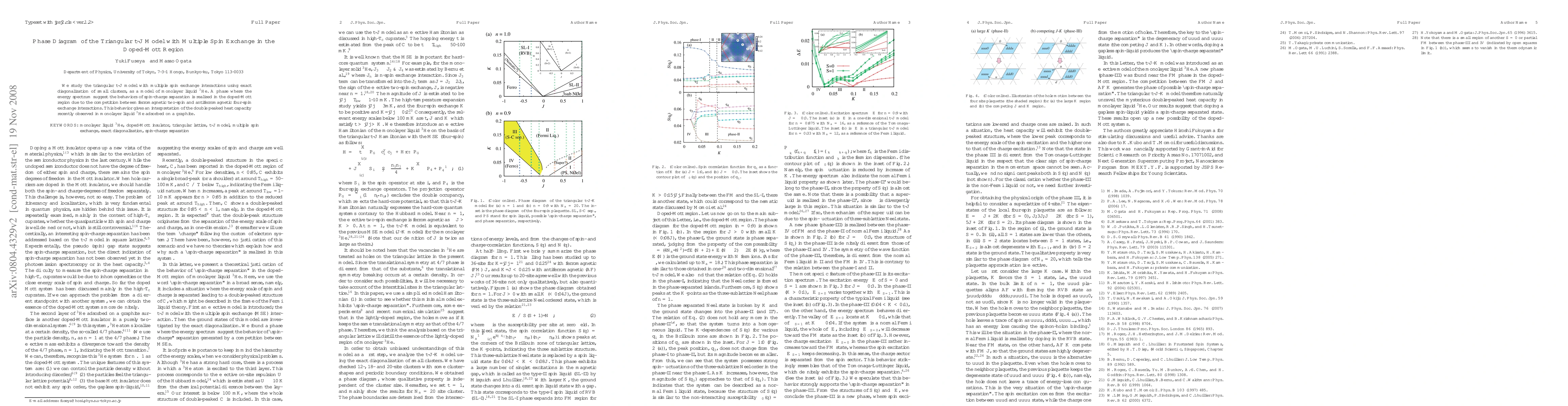 We study the triangular $t$-$J$ model with multiple spin exchange interactions using exact diagonalization of small clusters, as a model of monolayer liquid $^3$He. A phase where the energy spectrum suggest the behaviors of spin-charge separation is realized in the doped-Mott region due to the competition between ferromagnetic two-spin and antiferromagnetic four-spin exchange interactions. This behavior gives an interpretation of the double peaked heat capacity recently observed in monolayer liquid $^3$He adsorbed on a graphite.