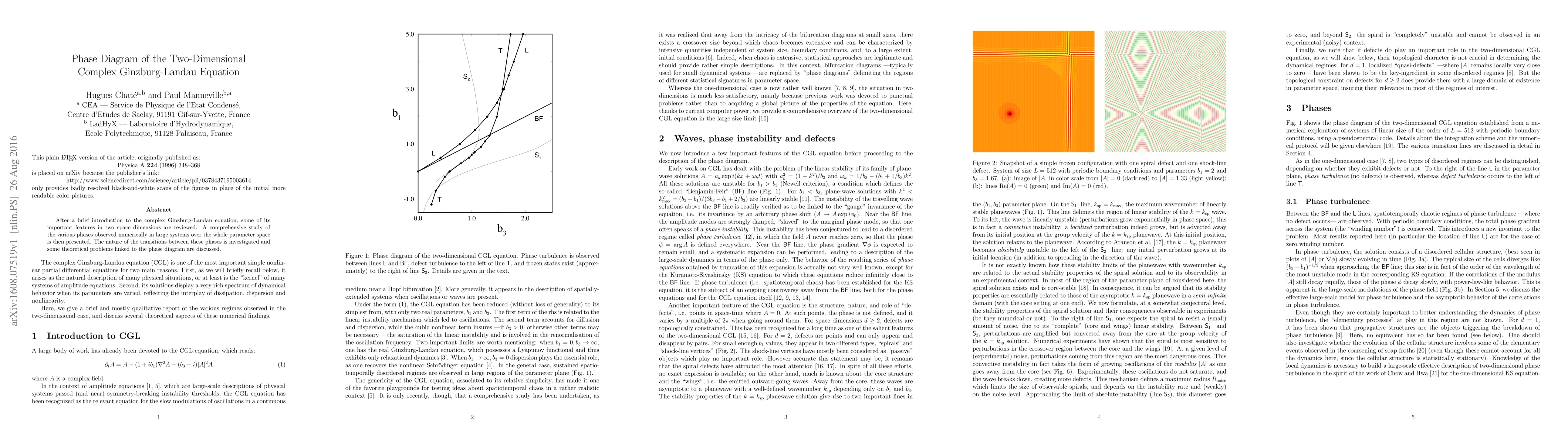 This paper reviews the complex Ginzburg-Landau equation's features in two dimensions and presents a detailed numerical study of its phases across the parameter space. The study investigates transitions between phases and discusses associated theoretical challenges.