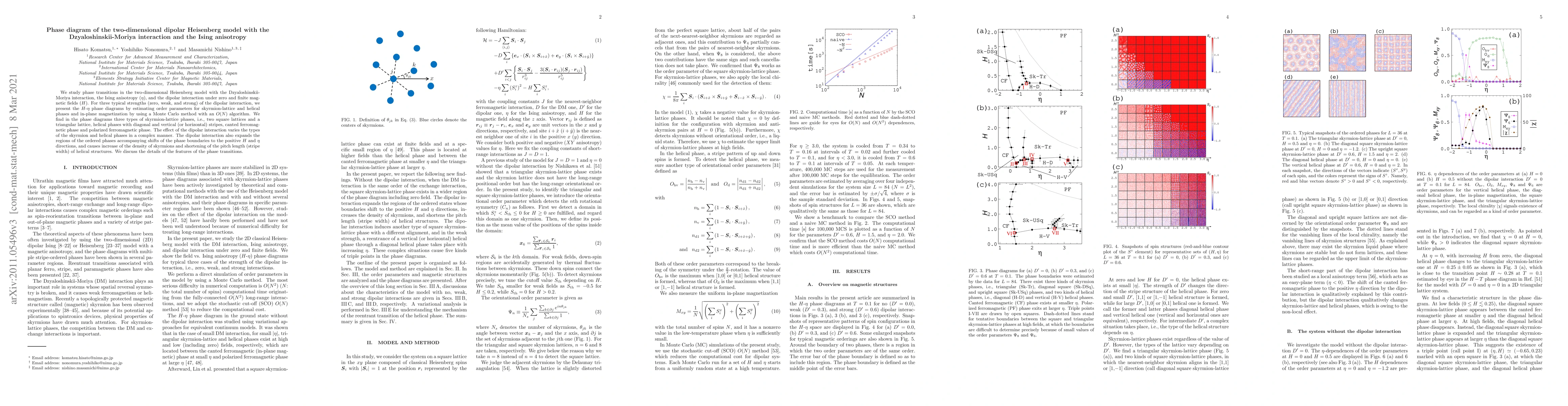 This paper investigates phase transitions in a two-dimensional Heisenberg model with Dzyaloshinskii-Moriya interaction, Ising anisotropy, and dipolar interaction. Using Monte Carlo simulations, it maps out $H$-$\eta$ phase diagrams revealing three skyrmion-lattice phases, helical phases, and ferromagnetic phases, showing how dipolar interactions influence these phases and shift phase boundaries.