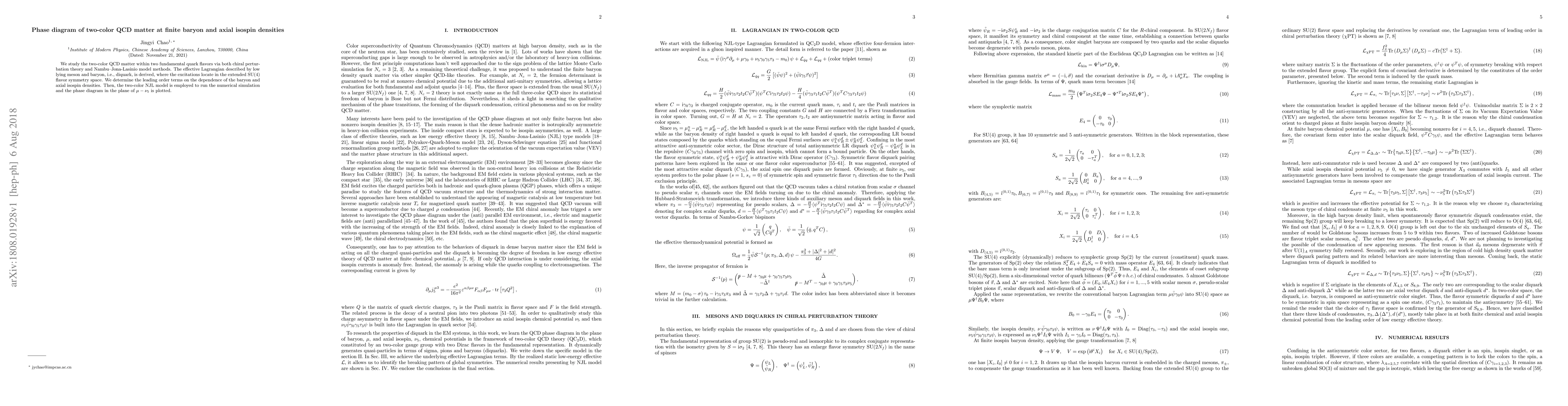 We study the two-color QCD matter within two fundamental quark flavors via both chiral perturbation theory and Nambu--Jona-Lasinio model methods. The effective Lagrangian described by low lying meson and baryon, i.e., diquark, is derived, where the excitations locate in the extended $\mathrm{SU}(4)$ flavor symmetry space. We determine the leading order terms on the dependence of the baryon and axial isospin densities. Then, the two-color NJL model is employed to run the numerical simulation and the phase diagram in the plane of $\mu-\nu_{5}$ is plotted.