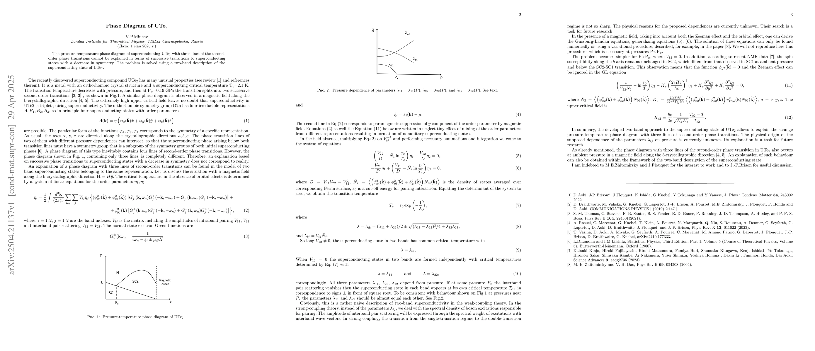 This research explores the pressure-temperature phase diagram of UTe$_2$, revealing three second-order phase transitions that cannot be explained by conventional symmetry-breaking superconductivity. A two-band superconducting model provides a solution to this complex phase behavior.