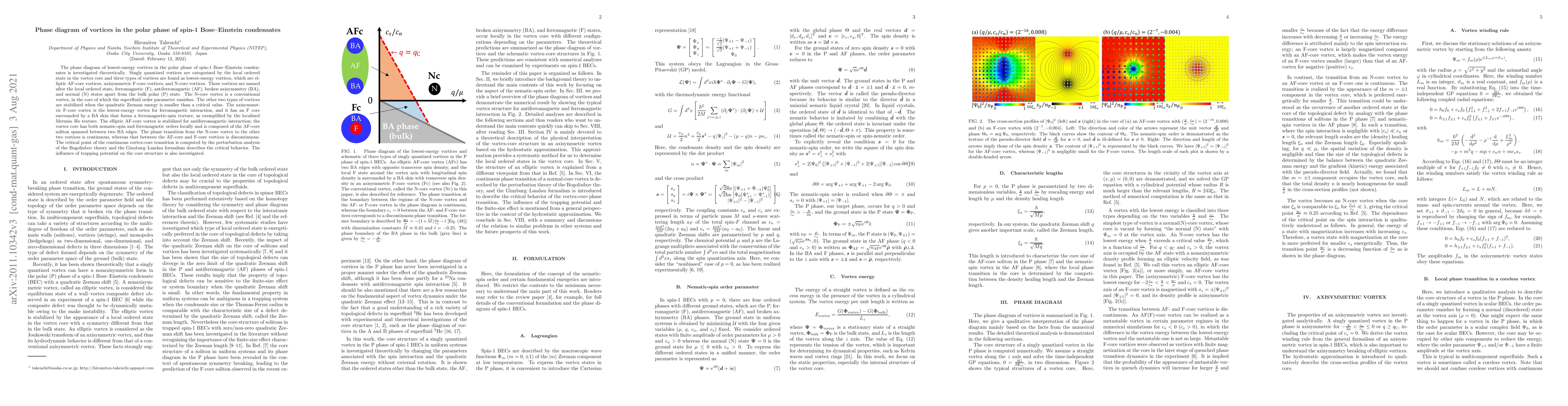 This paper investigates the phase diagram of lowest-energy vortices in the polar phase of spin-1 Bose-Einstein condensates, identifying three types: elliptic AF-core, axisymmetric F-core, and N-core vortices. The study reveals continuous and discontinuous transitions between these vortex types, with the critical point for the former computed via perturbation analysis.