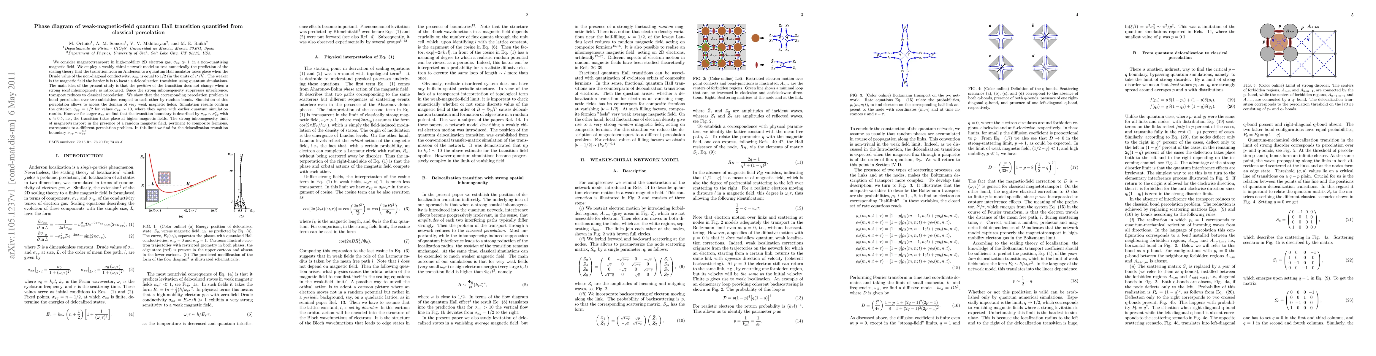 We consider magnetotransport in high-mobility 2D electron gas in a non-quantizing magnetic field. We employ a weakly chiral network model to test numerically the prediction of the scaling theory that the transition from an Anderson to a quantum Hall insulator takes place when the Drude value of the non-diagonal conductivity is equal to 1/2. The weaker is the magnetic field the harder it is to locate a delocalization transition using quantum simulations. The main idea of the present study is that the position of the transition does not change when a strong local inhomogeneity is introduced. Since the strong inhomogeneity suppresses interference, transport reduces to classical percolation. We show that the corresponding percolation problem is bond percolation over two sublattices coupled to each other by random bonds. Simulation of this percolation allows to access the domain of very weak magnetic fields. Simulation results confirm the criterion \sigma_{xy}=1/2 for values \sigma_{xx}\sim 10, where they agree with earlier quantum simulation results. However for larger \sigma_{xx} we find that the transition boundary is described by \sigma_{xy} \sigma_{xx}^k with k= 0.5, i.e., the transition takes place at higher magnetic fields. The strong inhomogeneity limit of magnetotransport in the presence of a random magnetic field, pertinent to composite fermions, corresponds to a different percolation problem. In this limit we find for the delocalization transition boundary \sigma_{xy} \sigma_{xx}^{0.6}.