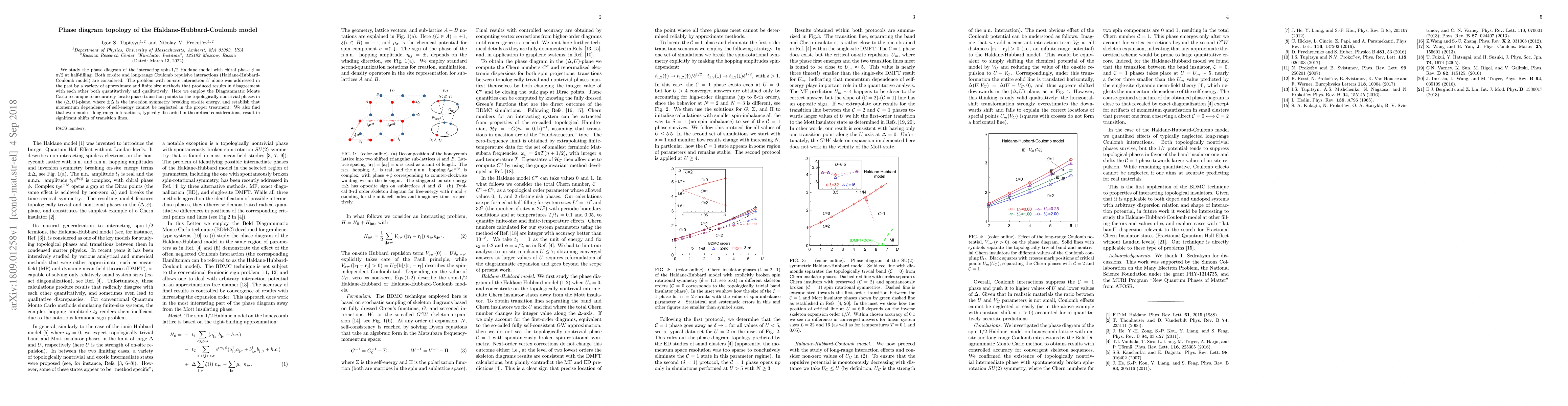 We study the phase diagram of the interacting spin-$1/2$ Haldane model with chiral phase $\phi = \pi/2$ at half-filling. Both on-site and long-range Coulomb repulsive interactions (Haldane-Hubbard-Coulomb model) are considered. The problem with on-site interaction $U$ alone was addressed in the past by a variety of approximate and finite size methods that produced results in disagreement with each other both quantitatively and qualitatively. Here we employ the Diagrammatic Monte Carlo technique to accurately locate phase transition points to the topologically nontrivial phases in the $(\Delta, U)$-plane, where $\pm \Delta$ is the inversion symmetry breaking on-site energy, and establish that momentum dependence of self-energy cannot be neglected in the proper treatment. We also find that even modest long-range interactions, typically discarded in theoretical considerations, result in significant shifts of transition lines.