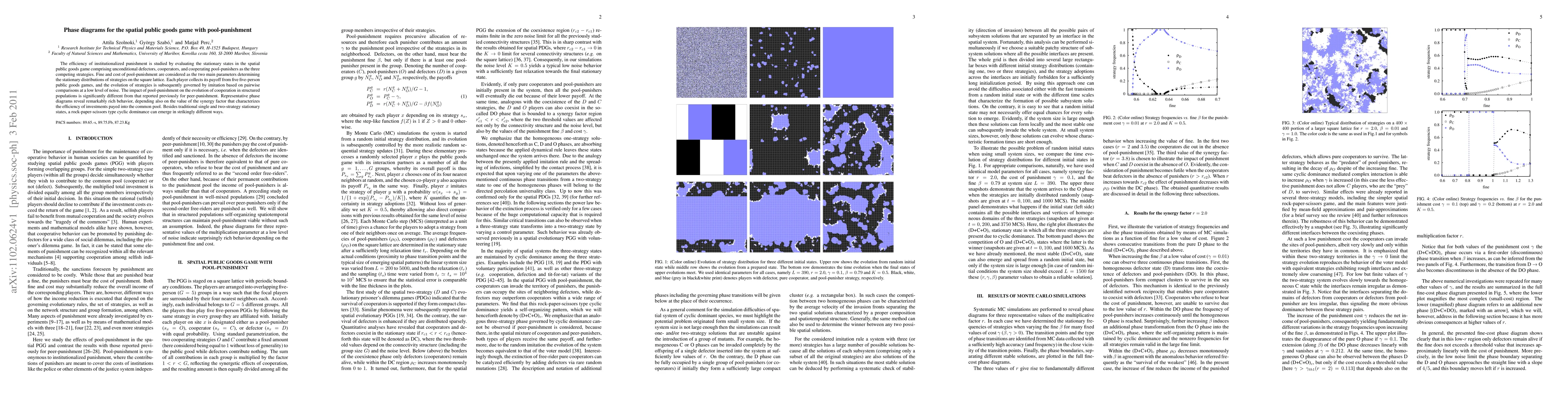 This paper investigates the efficiency of institutionalized pool-punishment in the spatial public goods game, revealing complex stationary states and cyclic dominance patterns influenced by the fine and cost of punishment, and the synergy factor. Unlike peer-punishment, pool-punishment significantly alters cooperative evolution in structured populations.