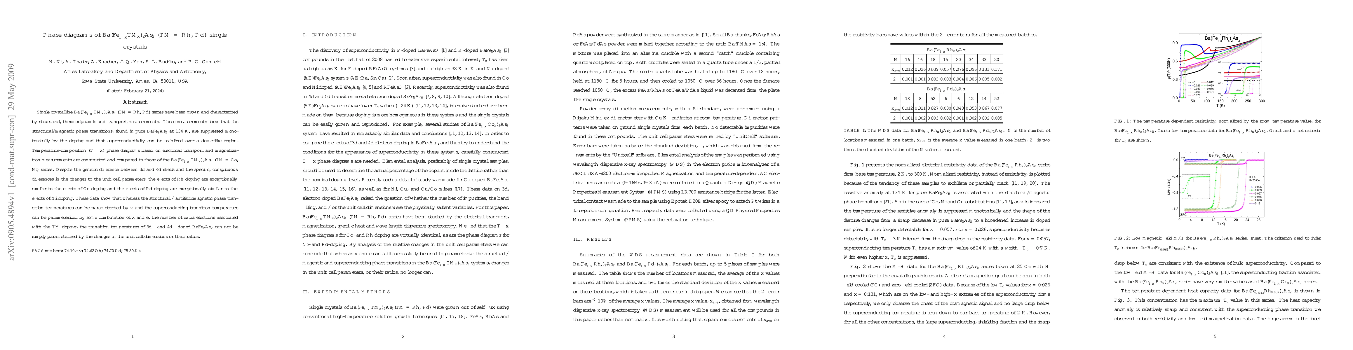 This paper investigates the phase diagrams of Ba(Fe(1-x)TMx)2As2 (TM = Rh, Pd) single crystals, showing that doping suppresses structural/magnetic phase transitions and stabilizes superconductivity. The Rh and Pd doping effects are similar to Co and Ni doping, respectively, despite differences in electron shell types, indicating complex relationships between unit cell changes and transition temperatures.