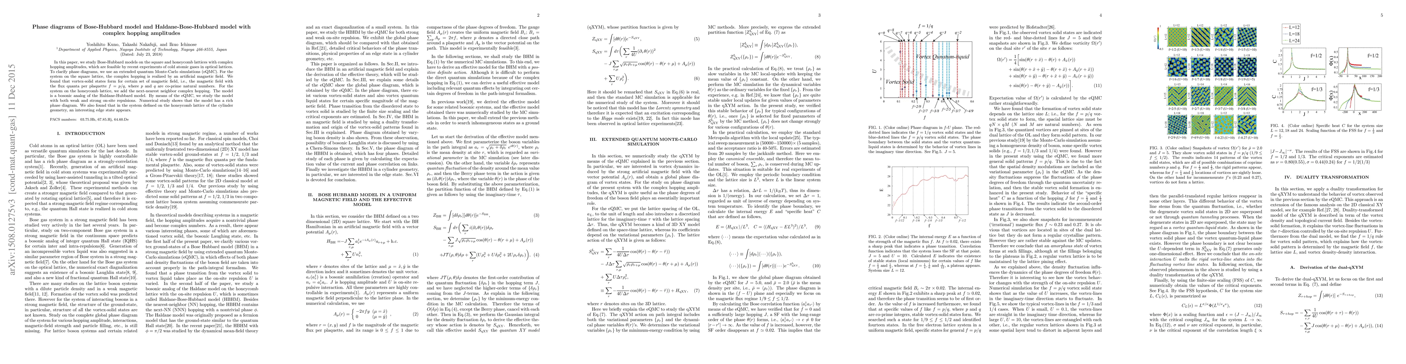 This paper investigates Bose-Hubbard models on square and honeycomb lattices with complex hopping amplitudes, employing extended quantum Monte-Carlo simulations. It reveals vortex-solid states on the square lattice and a rich phase diagram with edge states on the honeycomb lattice.