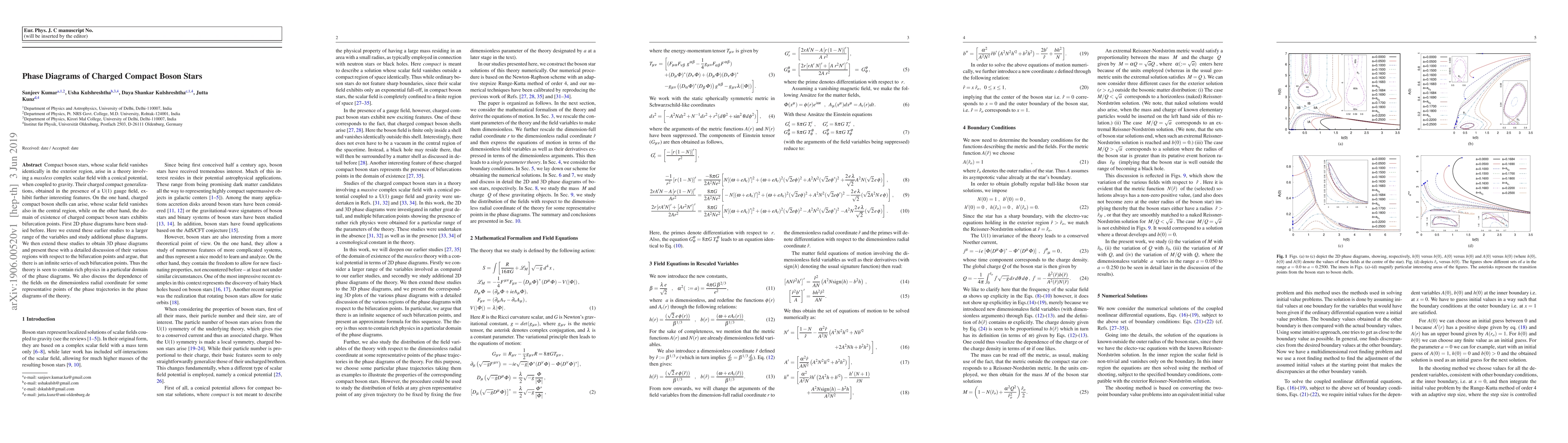 Compact boson stars, whose scalar field vanishes identically in the exterior region, arise in a theory involving a {\it massless} complex scalar field with a conical potential, when coupled to gravity. Their charged compact generalizations, obtained in the presence of a U(1) gauge field, exhibit further interesting features. On the one hand, charged compact boson shells can arise, whose scalar field vanishes also in the central region, while on the other hand, the domain of existence of charged compact boson stars exhibits bifurcation points. First 2D phase diagrams have been studied before. Here we extend these earlier studies to a larger range of the variables and study additional phase diagrams. We then extend these studies to obtain 3D phase diagrams and present these with a detailed discussion of their various regions with respect to the bifurcation points and argue, that there is an infinite series of such bifurcation points. Thus the theory is seen to contain rich physics in a particular domain of the phase diagrams. We also discuss the dependence of the fields on the dimensionless radial coordinate for some representative points of the phase trajectories in the phase diagrams of the theory.