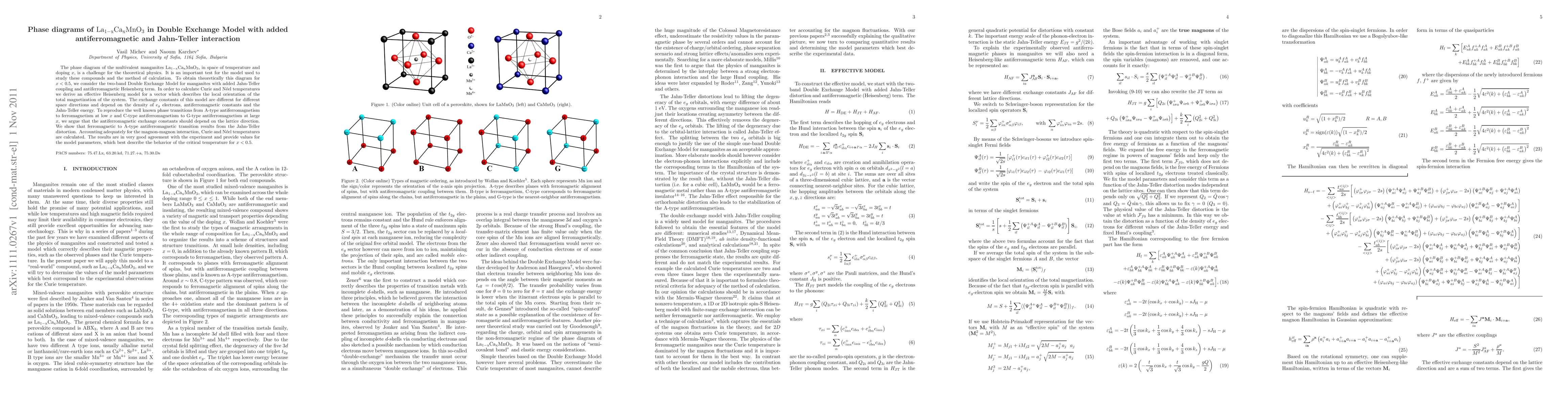 Researchers used a Double Exchange Model to study phase diagrams of La1-xCaxMnO3 compounds, including the impact of Jahn-Teller coupling and antiferromagnetic interactions, achieving good agreement with experimental results.