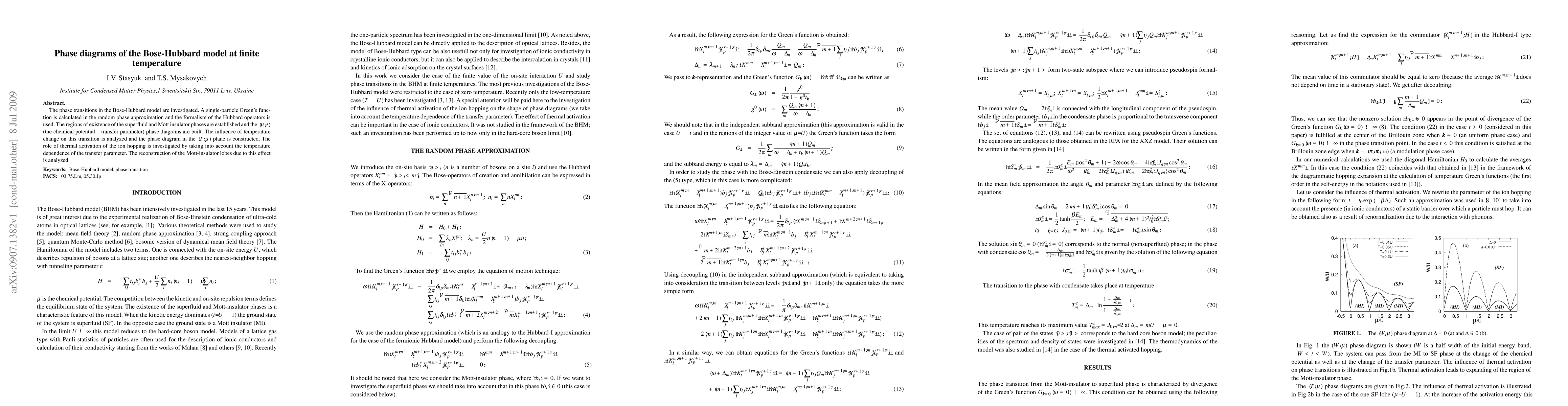 This paper investigates phase transitions in the Bose-Hubbard model, establishing the regions of superfluid and Mott insulator phases and constructing $(\mu,t)$ and $(T,\mu)$ phase diagrams. It analyzes the thermal activation of ion hopping and its effect on the reconstruction of Mott-insulator lobes.
