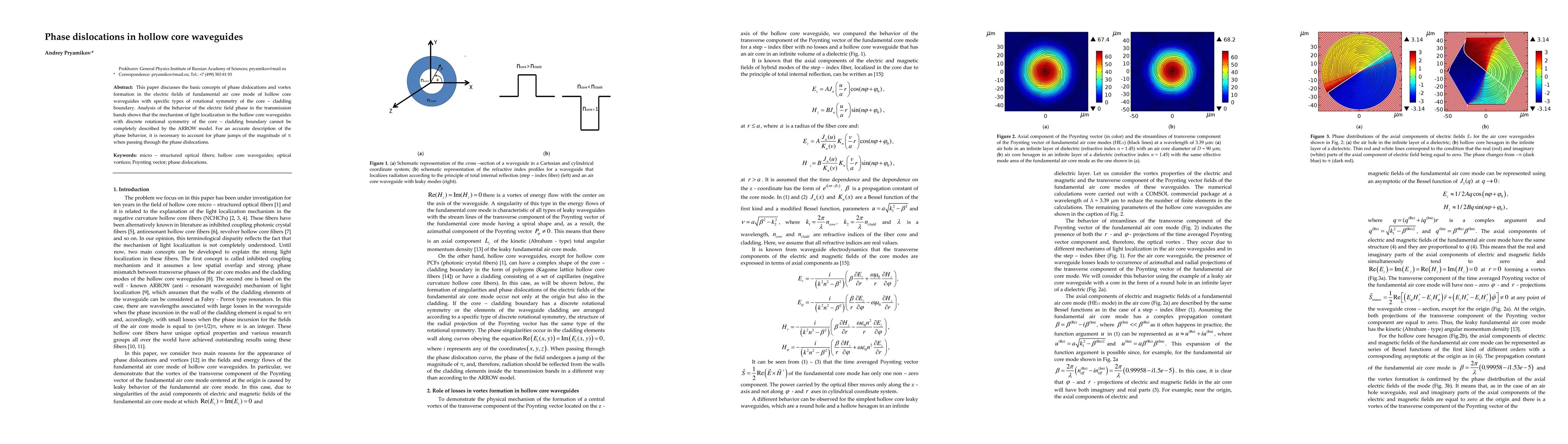 This paper explores phase dislocations and vortex formation in the electric fields of hollow core waveguides, revealing that the ARROW model is insufficient for describing light localization due to pi-magnitude phase jumps at phase dislocations.