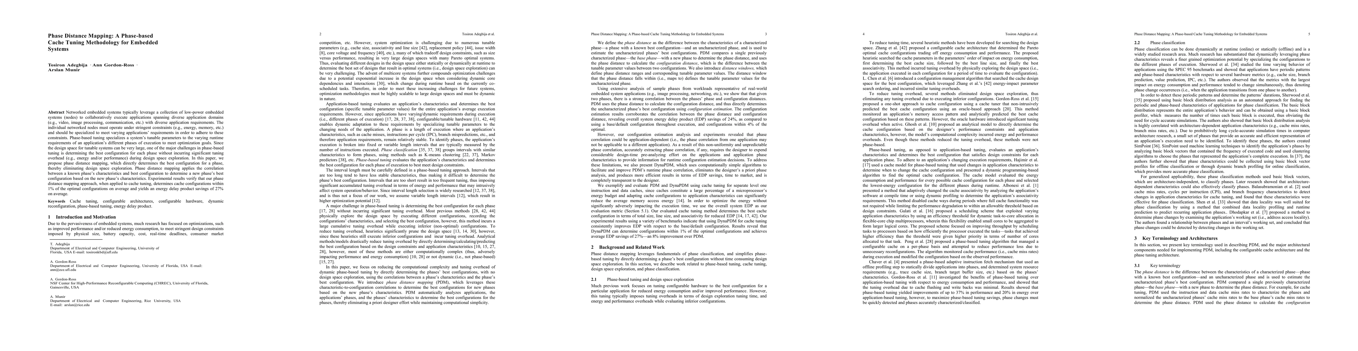 Networked embedded systems typically leverage a collection of low-power embedded systems (nodes) to collaboratively execute applications spanning diverse application domains (e.g., video, image processing, communication, etc.) with diverse application requirements. The individual networked nodes must operate under stringent constraints (e.g., energy, memory, etc.) and should be specialized to meet varying application requirements in order to adhere to these constraints. Phase-based tuning specializes system tunable parameters to the varying runtime requirements of different execution phases to meet optimization goals. Since the design space for tunable systems can be very large, one of the major challenges in phase-based tuning is determining the best configuration for each phase without incurring significant tuning overhead (e.g., energy and/or performance) during design space exploration. In this paper, we propose phase distance mapping, which directly determines the best configuration for a phase, thereby eliminating design space exploration. Phase distance mapping applies the correlation between the characteristics and best configuration of a known phase to determine the best configuration of a new phase. Experimental results verify that our phase distance mapping approach, when applied to cache tuning, determines cache configurations within 1 % of the optimal configurations on average and yields an energy delay product savings of 27 % on average.