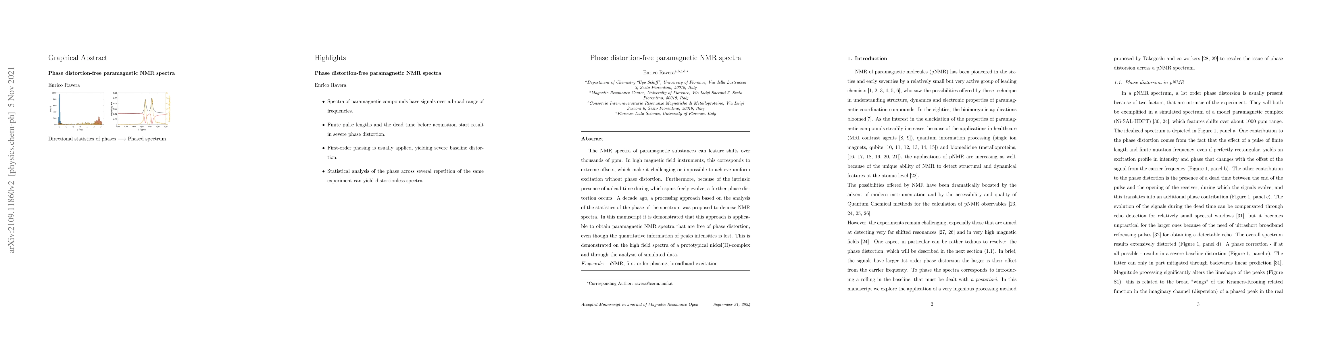 The NMR spectra of paramagnetic substances can feature shifts over thousands of ppm. In high magnetic field instruments, this corresponds to extreme offsets, which make it challenging or impossible to achieve uniform excitation without phase distortion. Furthermore, because of the intrinsic presence of a dead time during which spins freely evolve, a further phase distortion occurs. A decade ago, a processing approach based on the analysis of the statistics of the phase of the spectrum was proposed to denoise NMR spectra. In this manuscript it is demonstrated that this approach is applicable to obtain paramagnetic NMR spectra that are free of phase distortion, even though the quantitative information of peaks intensities is lost. This is demonstrated on the high field spectra of a prototypical nickel(II)-complex and through the analysis of simulated data.