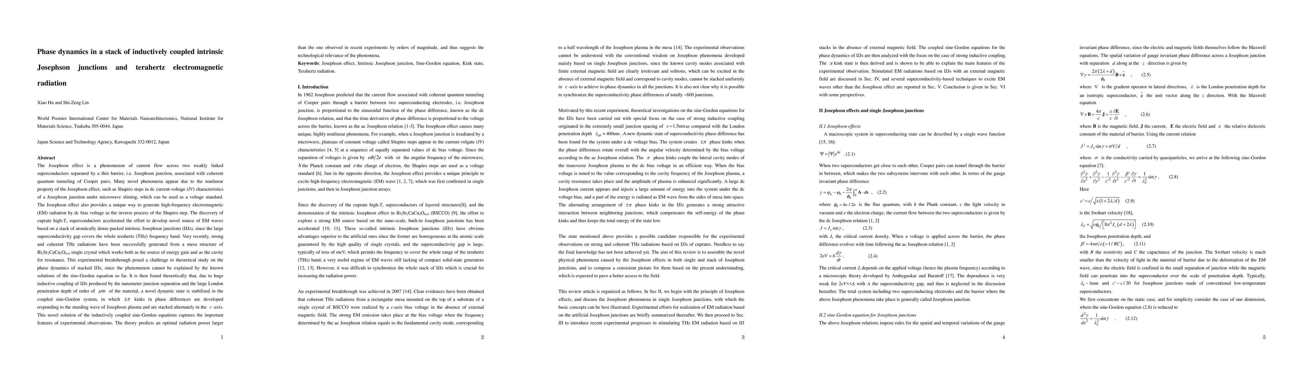 The Josephson effects associated with quantum tunneling of Cooper pairs manifest as nonlinear relations between the superconductivity phase difference and the bias current and voltage. Many novel phenomena appear, such as Shapiro steps in dc cuurent-voltage (IV) characteristics of a Josephson junction under microwave shining, which can be used as a voltage standard. Inversely, the Josephson effects provide a unique way to generate high-frequency electromagnetic (EM) radiation by dc bias voltage. The discovery of cuprate high-Tc superconductors accelerated the effort to develop novel source of EM waves based on a stack of atomically dense-packed intrinsic Josephson junctions (IJJs), since the large superconductivity gap covers the whole terahertz frequency band. Very recently, strong and coherent terahertz radiations have been successfully generated from a mesa structure of $\rm{Bi_2Sr_2CaCu_2O_{8+\delta}}$ single crystal which works both as the source of energy gain and as the cavity for resonance. It is then found theoretically that, due to huge inductive coupling of IJJs produced by the nanometer junction separation and the large London penetration depth of order of $\rm{\mu m}$ of the material, a novel dynamic state is stabilized in the coupled sine-Gordon system, in which $\pm \pi$ kinks in phase differences are developed responding to the standing wave of Josephson plasma and are stacked alternatively in the c-axis. This novel solution of the inductively coupled sine-Gordon equations captures the important features of experimental observations. The theory predicts an optimal radiation power larger than the one available to date by orders of magnitude, and thus suggests the technological relevance of the phenomena.