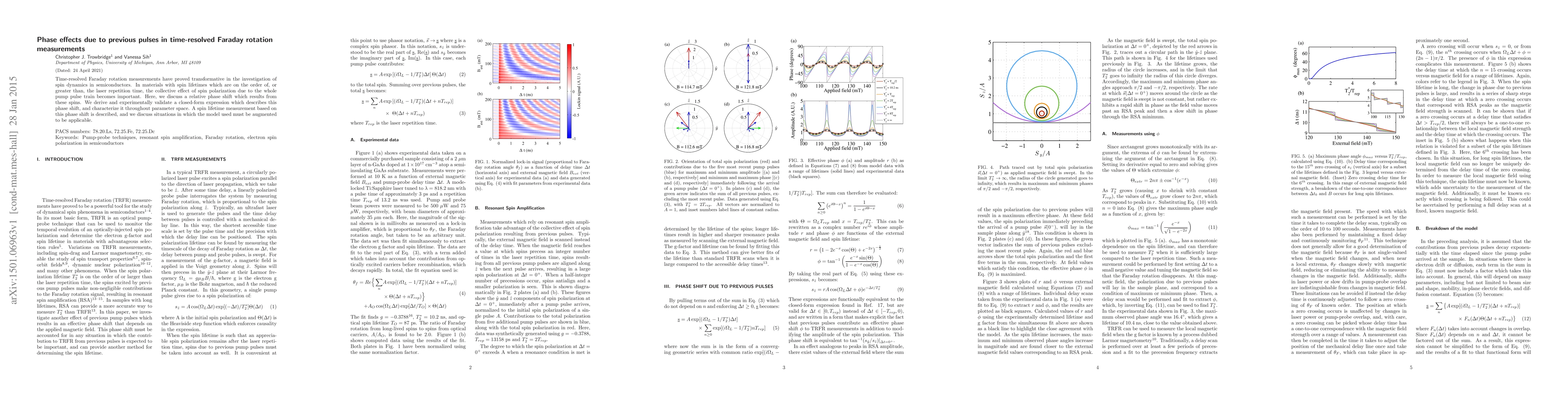 This paper investigates the phase effects from previous laser pulses in time-resolved Faraday rotation measurements, deriving a closed-form expression for the resulting phase shift. Experimental validation and characterization of the model across various parameters are provided, along with a method for measuring spin lifetimes based on this phase shift.