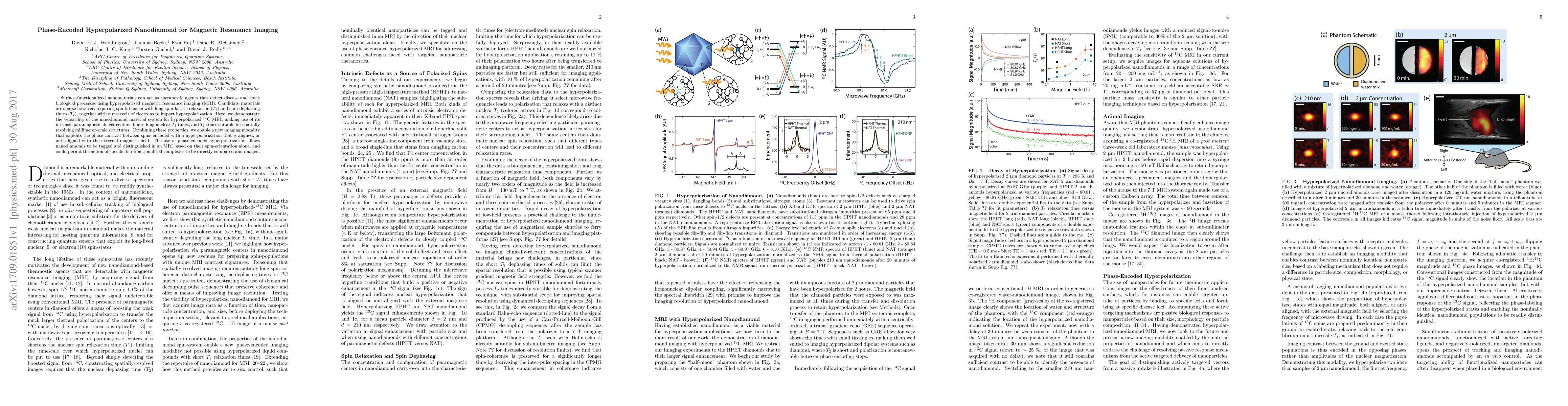 This paper demonstrates the use of phase-encoded hyperpolarized nanodiamonds for advanced magnetic resonance imaging (MRI) by leveraging their long nuclear T1 and T2 times. The phase-contrast technique enables the tagging and differentiation of nanodiamonds based on spin orientation, potentially allowing for the direct comparison and imaging of specific bio-functionalized complexes.