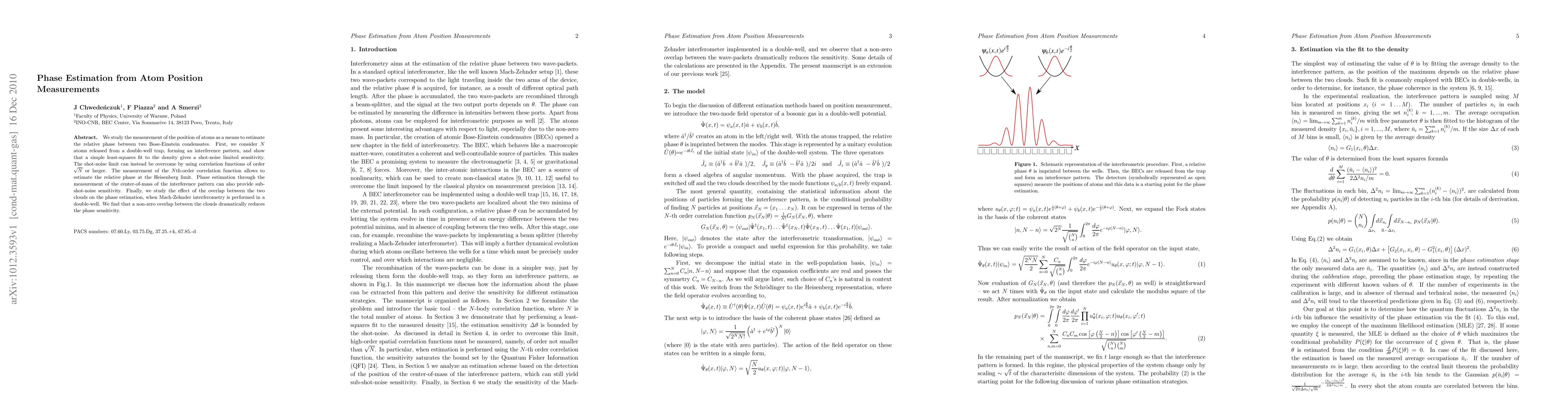 We study the measurement of the position of atoms as a means to estimate the relative phase between two Bose-Einstein condensates. First, we consider $N$ atoms released from a double-well trap, forming an interference pattern, and show that a simple least-squares fit to the density gives a shot-noise limited sensitivity. The shot-noise limit can instead be overcome by using correlation functions of order $\sqrt{N}$ or larger. The measurement of the $N\mathrm{th}$-order correlation function allows to estimate the relative phase at the Heisenberg limit. Phase estimation through the measurement of the center-of-mass of the interference pattern can also provide sub-shot-noise sensitivity. Finally, we study the effect of the overlap between the two clouds on the phase estimation, when Mach-Zehnder interferometry is performed in a double-well.