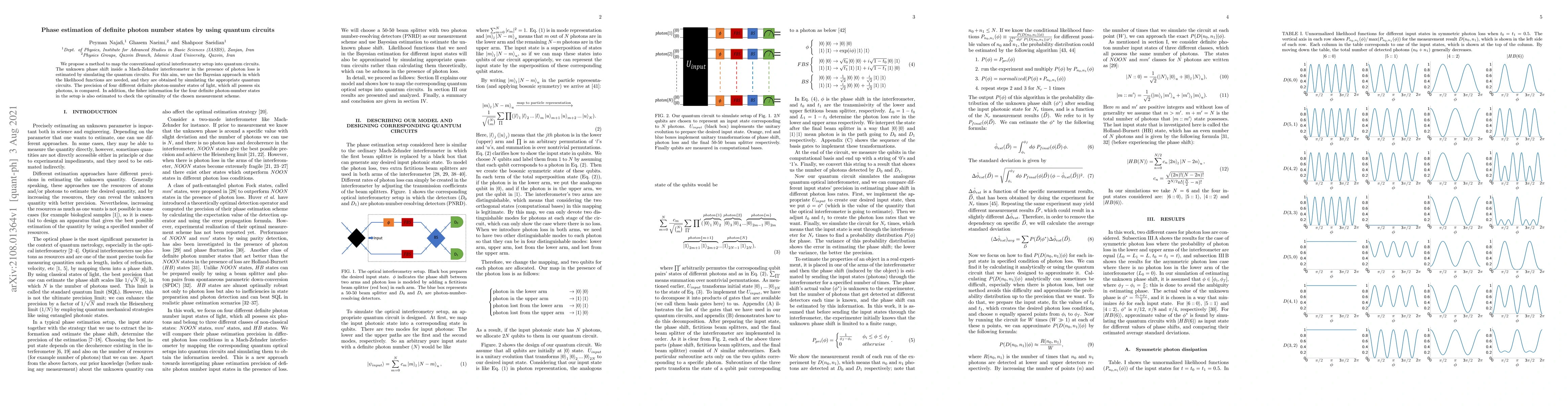 We propose a method to map the conventional optical interferometry setup into quantum circuits. The unknown phase shift inside a Mach-Zehnder interferometer in the presence of photon loss is estimated by simulating the quantum circuits. For this aim, we use the Bayesian approach in which the likelihood functions are needed, and they are obtained by simulating the appropriate quantum circuits. The precision of four different definite photon-number states of light, which all possess six photons, is compared. In addition, the fisher information for the four definite photon-number states in the setup is also estimated to check the optimality of the chosen measurement scheme.