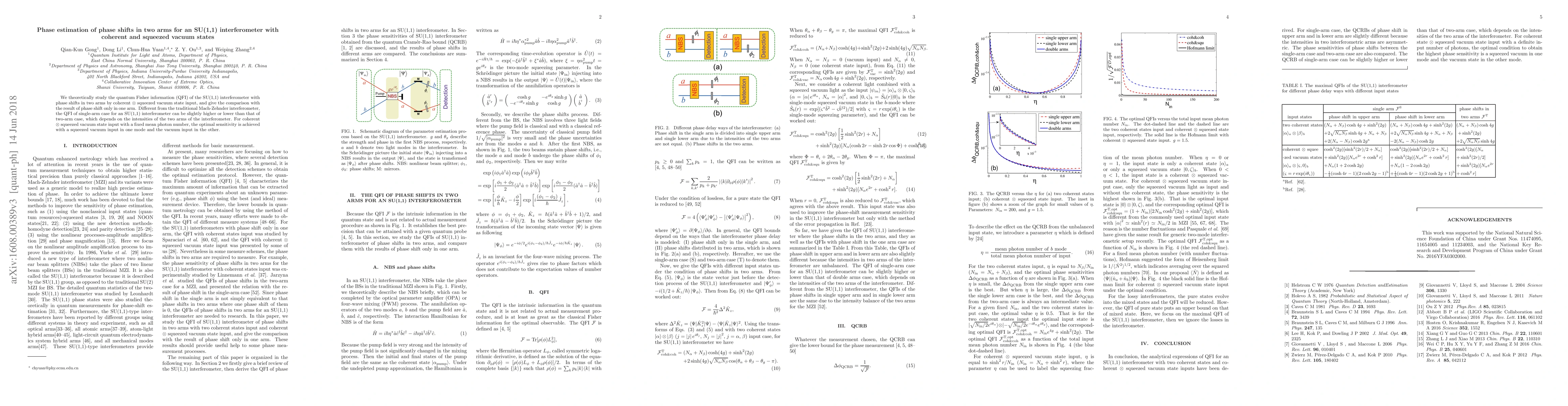 We theoretically present the quantum Cram\'{e}r-Rao bounds (QCRB) of an SU(1,1) interferometer for Gaussian states input with and without the internal photonic losses. The phase shifts in the single arm and in the double arms are studied and the corresponding analytical expressions of quantum Fisher information with Gaussian input states are presented. Different from the traditional Mach-Zehnder interferometer, the QCRB of single arm case is slightly higher or lower than that of double arms case depending on the input states. With a fixed mean photon number and for pure Gaussian state input, the optimal sensitivity is achieved with a squeezed vacuum input in one mode and the vacuum input in the other. We compare the QCRB with the standard quantum limit and Heisenberg limit. In the case of small internal losses the QCRB can beat the standard quantum limit.