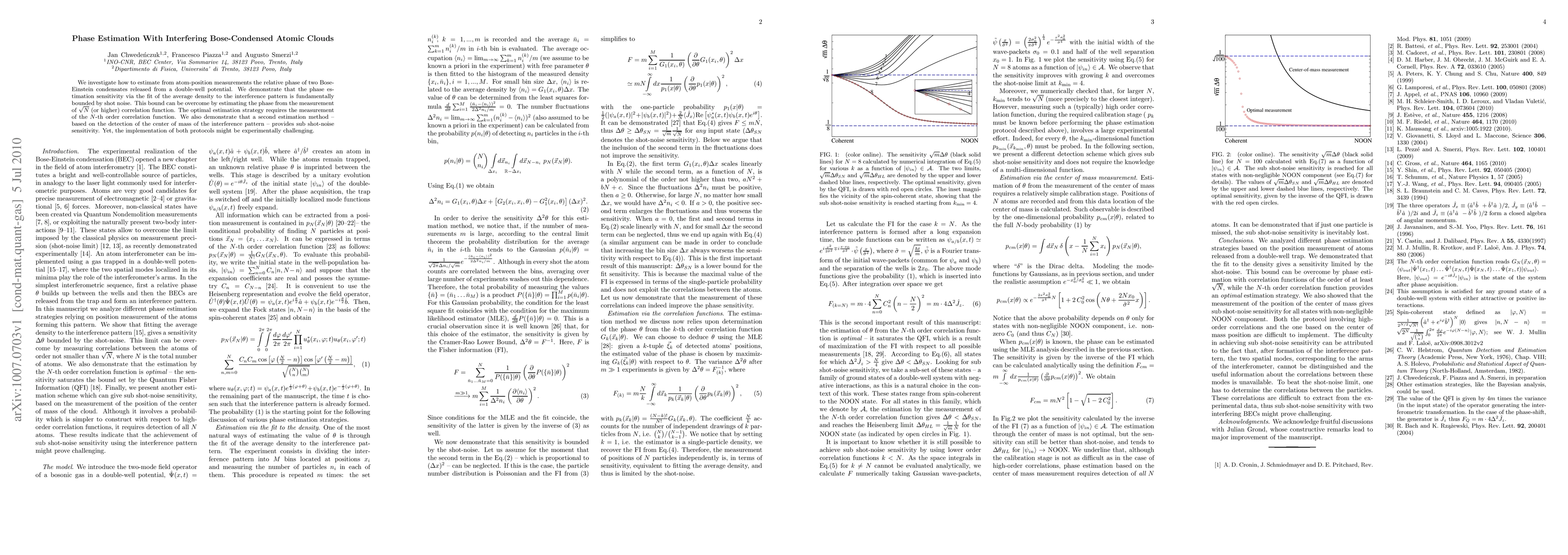 We investigate how to estimate from atom-position measurements the relative phase of two Bose-Einstein condensates released from a double-well potential. We demonstrate that the phase estimation sensitivity via the fit of the average density to the interference pattern is fundamentally bounded by shot noise. This bound can be overcome by estimating the phase from the measurement of $\sqrt N$ (or higher) correlation function. The optimal estimation strategy requires the measurement of the $N$-th order correlation function. We also demonstrate that a second estimation method -- based on the detection of the center of mass of the interference pattern -- provides sub shot-noise sensitivity. Yet, the implementation of both protocols might be experimentally challenging.