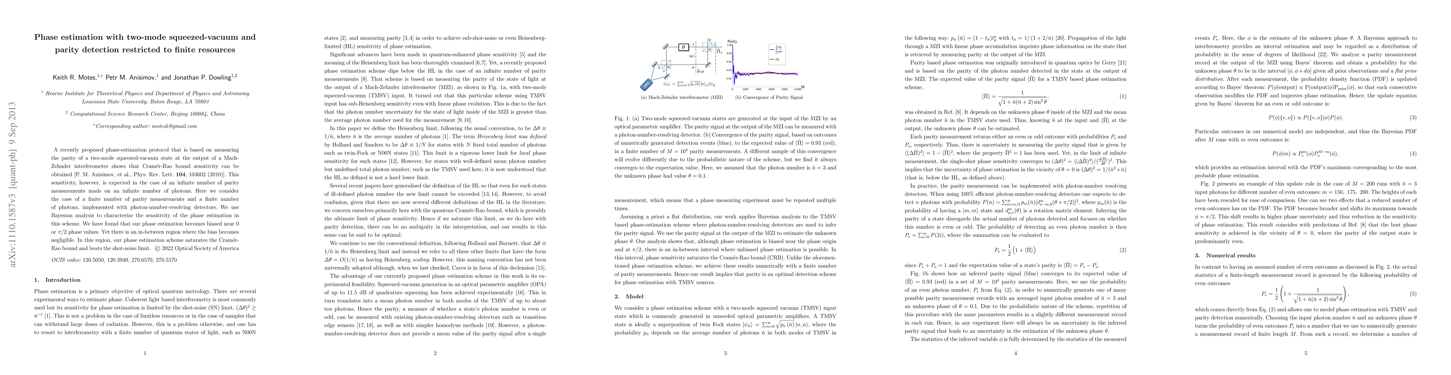 This paper investigates a phase-estimation protocol using two-mode squeezed-vacuum and parity detection, finding that it achieves Cramér-Rao bound sensitivity under ideal conditions. It examines the protocol's performance with finite resources and demonstrates that while the method becomes biased near 0 or $\pi/2$ phase values, it still saturates the Cramér-Rao bound and outperforms the shot-noise limit in an intermediate phase range.