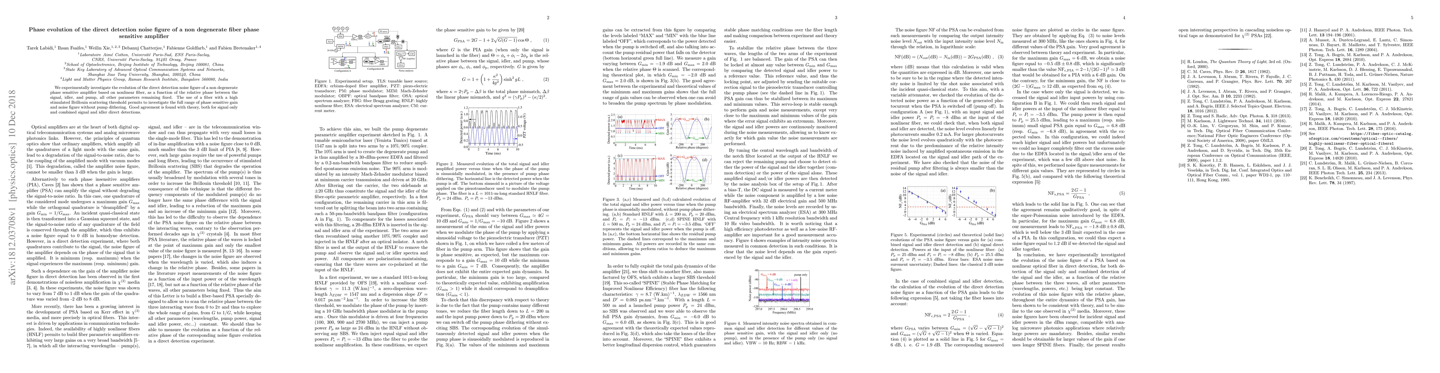 This study experimentally investigates the direct detection noise figure of a nondegenerate phase sensitive fiber amplifier, focusing on the phase relationship between signal, idler, and pump. The results show good theoretical agreement and enable full-range analysis without pump dithering due to high stimulated Brillouin scattering threshold fiber.