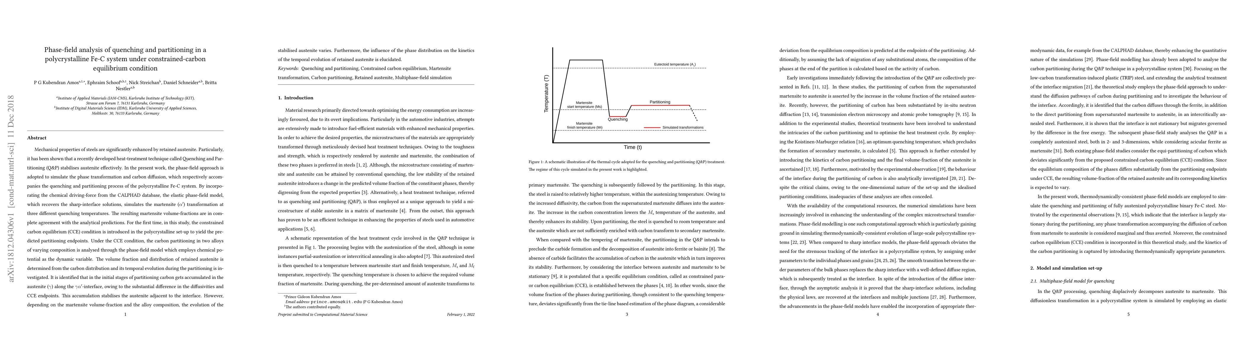 Mechanical properties of steels are significantly enhanced by retained austenite. Particularly, it has been shown that a recently developed heat-treatment technique called Quenching and Partitioning (Q\&P) stabilises austenite effectively. In the present work, the phase-field approach is adopted to simulate the phase transformation and carbon diffusion, which respectively accompanies the quenching and partitioning process of the polycrystalline Fe-C system. By incorporating the chemical driving-force from the CALPHAD database, the elastic phase-field model, which recovers the sharp-interface solutions, simulates the martensite (alpha') transformation at three different quenching temperatures. The resulting martensite volume-fractions are in complete agreement with the analytical predictions. For the first time, in this study, the constrained carbon equilibrium (CCE) condition is introduced in the polycrystalline set-up to yield the predicted partitioning endpoints. Under the CCE condition, the carbon partitioning in two alloys of varying composition is analysed through the phase-field model which employs chemical potential as the dynamic variable. The volume fraction and distribution of retained austenite is determined from the carbon distribution and its temporal evolution during the partitioning is investigated. It is identified that in the initial stages of partitioning carbon gets accumulated in the austenite ($\gamma$) along the $\gamma\alpha'$-interface, owing to the substantial difference in the diffusivities and CCE endpoints. This accumulation stabilises the austenite adjacent to the interface. However, depending on the martensite volume-fraction and the alloy composition, the evolution of the stabilised austenite varies. Furthermore, the influence of the phase distribution on the kinetics of the temporal evolution of retained austenite is elucidated.