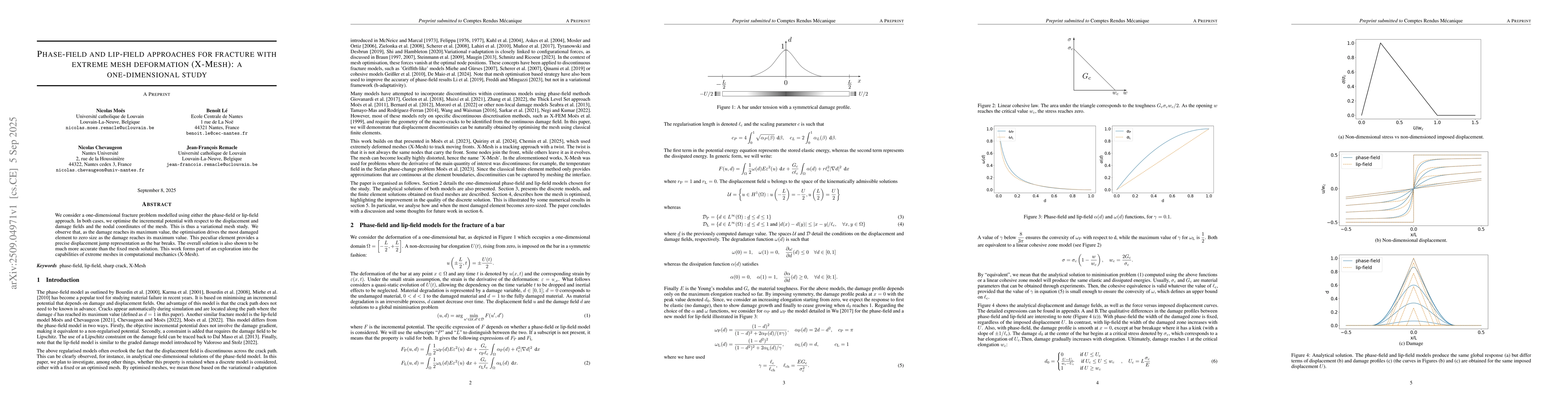 We consider a one-dimensional fracture problem modelled using either the phase-field or lip-field approach. In both cases, we optimise the incremental potential with respect to the displacement and damage fields and the nodal coordinates of the mesh. This is thus a variational mesh study. We observe that, as the damage reaches its maximum value, the optimisation drives the most damaged element to zero size as the damage reaches its maximum value. This peculiar element provides a precise displacement jump representation as the bar breaks. The overall solution is also shown to be much more accurate than the fixed mesh solution. This work forms part of an exploration into the capabilities of extreme meshes in computational mechanics (X-Mesh).