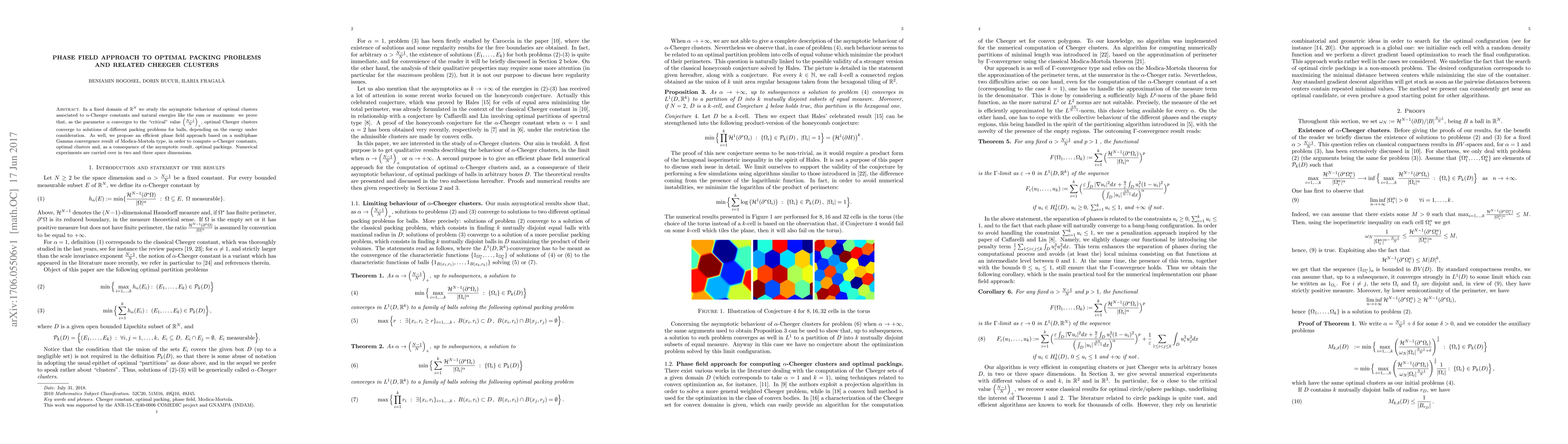 The paper explores how optimal clusters in a fixed domain converge to different packing problems as the parameter alpha approaches its critical value, leading to an efficient phase field approach for computing Cheeger constants and packings.