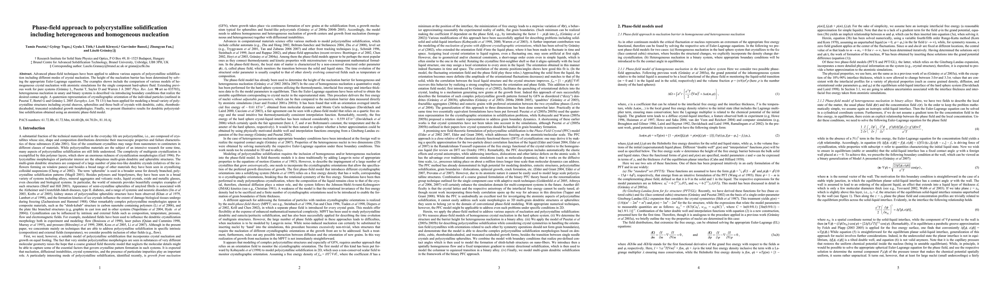 This paper applies advanced phase-field techniques to model polycrystalline solidification, focusing on both heterogeneous and homogeneous nucleation. It introduces boundary conditions to simulate heterogeneous nucleation and uses a quaternion representation to model diverse polycrystalline structures.