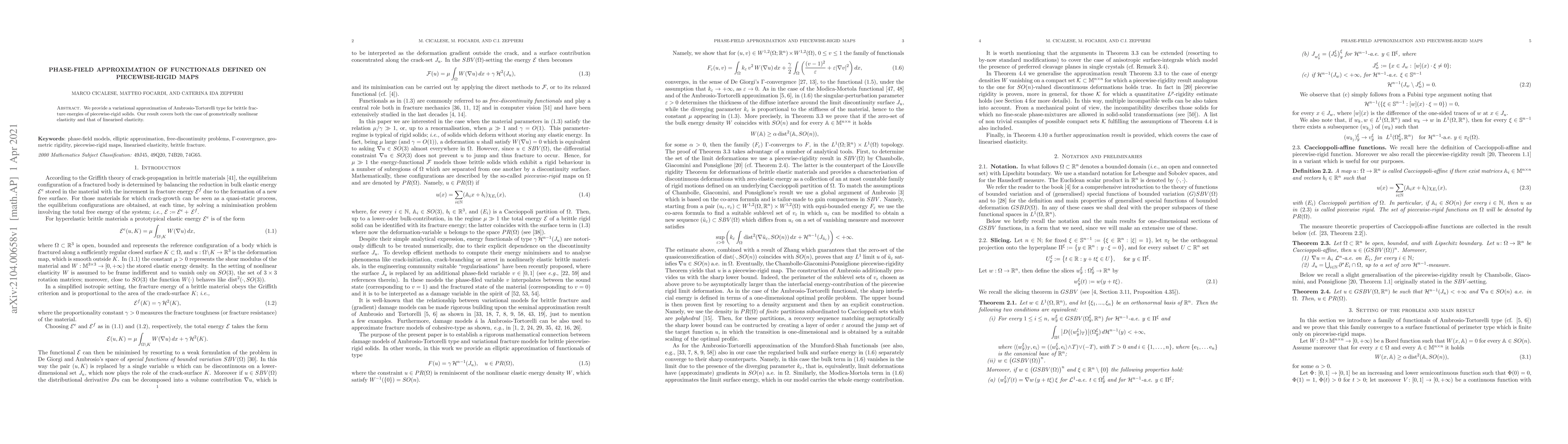 We provide a variational approximation of Ambrosio-Tortorelli type for brittle fracture energies of piecewise-rigid solids. Our result covers both the case of geometrically nonlinear elasticity and that of linearised elasticity.