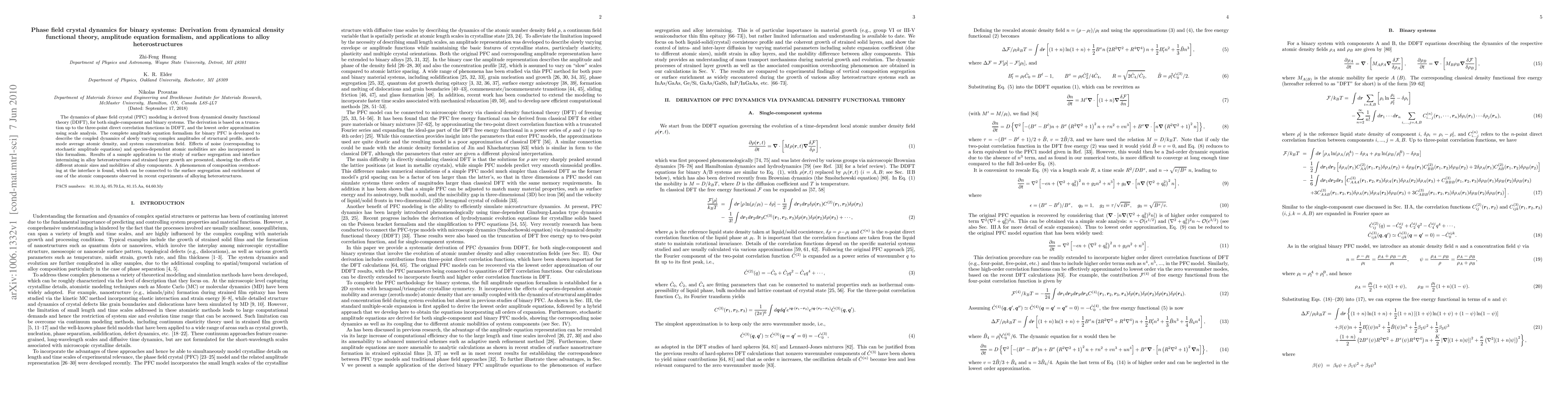 This research derives phase field crystal (PFC) dynamics for binary systems from dynamical density functional theory (DDFT), developing a comprehensive amplitude equation formalism. It accounts for noise and species-dependent atomic mobilities, demonstrating the model's application in studying alloy heterostructures' surface segregation and interface intermixing. A key finding is the composition overshooting at interfaces, linking it to experimental observations of alloy surface enrichment.