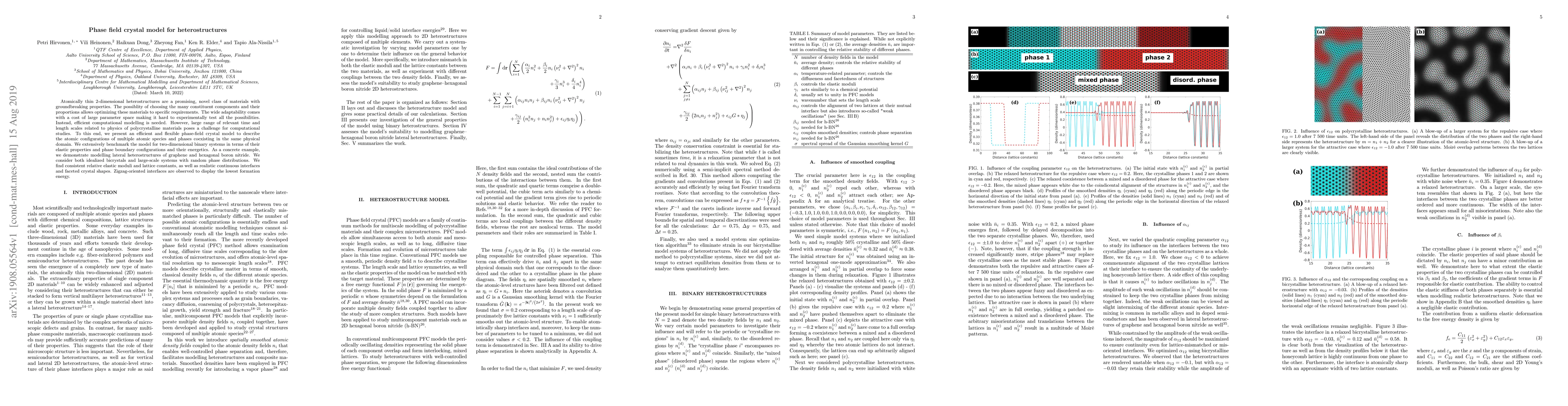 This research introduces a phase-field crystal model to efficiently simulate atomic configurations in 2D heterostructures like graphene and hexagonal boron nitride. Benchmarked for binary systems, it accurately predicts elastic properties, phase boundaries, and realistic crystal shapes, aiding in optimizing material design despite extensive parameter spaces.
