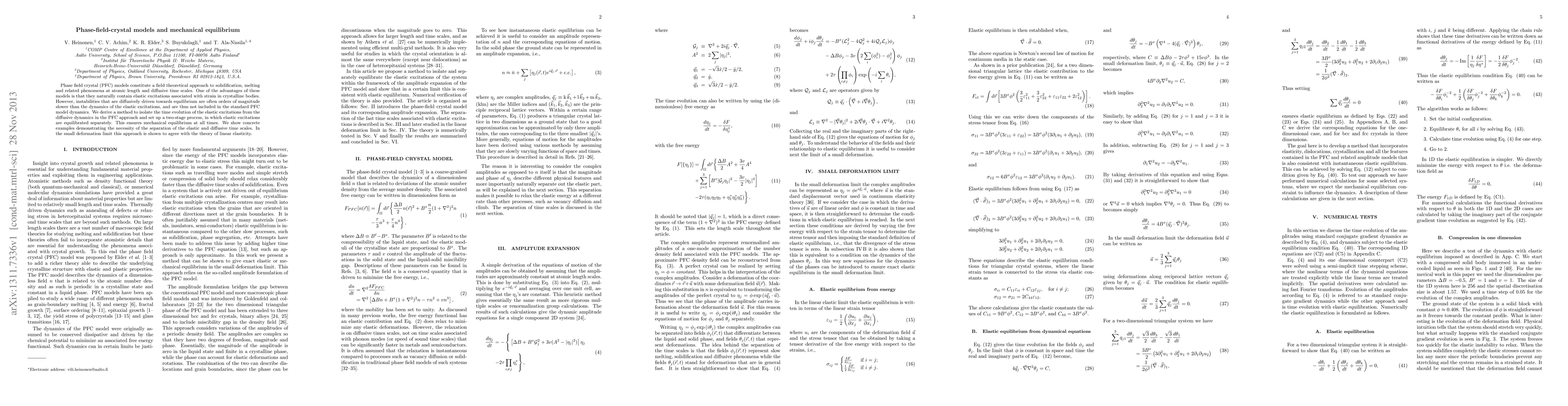 Phase field crystal (PFC) models constitute a field theoretical approach to solidification, melting and related phenomena at atomic length and diffusive time scales. One of the advantages of these models is that they naturally contain elastic excitations associated with strain in crystalline bodies. However, instabilities that are diffusively driven towards equilibrium are often orders of magnitude slower than the dynamics of the elastic excitations, and are thus not included in the standard PFC model dynamics. We derive a method to isolate the time evolution of the elastic excitations from the diffusive dynamics in the PFC approach and set up a two-stage process, in which elastic excitations are equilibrated separately. This ensures mechanical equilibrium at all times. We show concrete examples demonstrating the necessity of the separation of the elastic and diffusive time scales. In the small deformation limit this approach is shown to agree with the theory of linear elasticity.