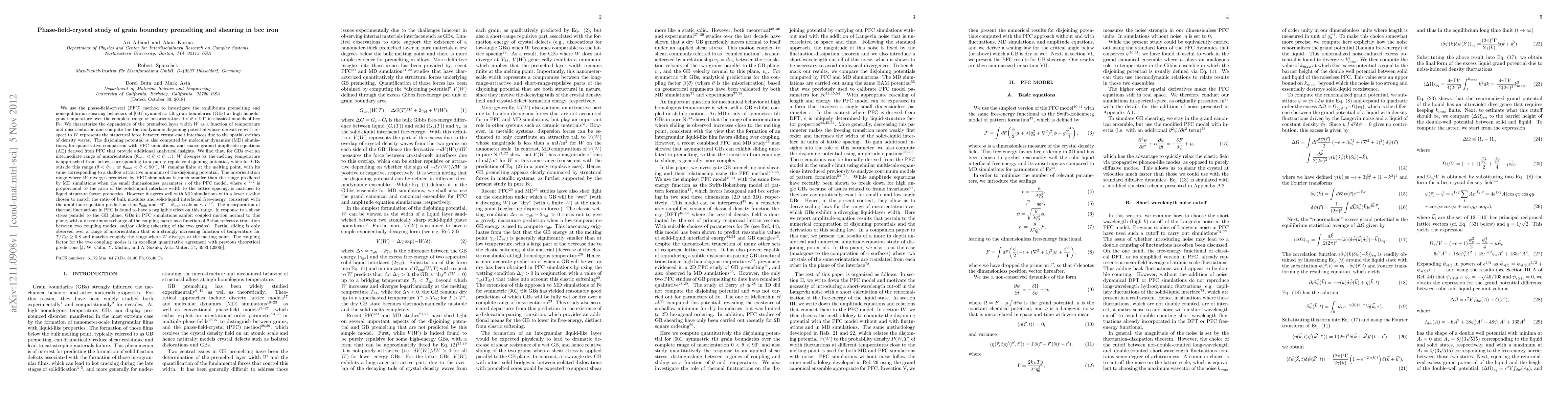 This study employs the phase-field-crystal method to explore the premelting and shearing behaviors of grain boundaries in bcc iron, revealing a divergence in premelted layer width near the melting point for intermediate misorientations. The research also identifies a transition in coupling behavior under shear stress, correlating well with prior theoretical predictions.