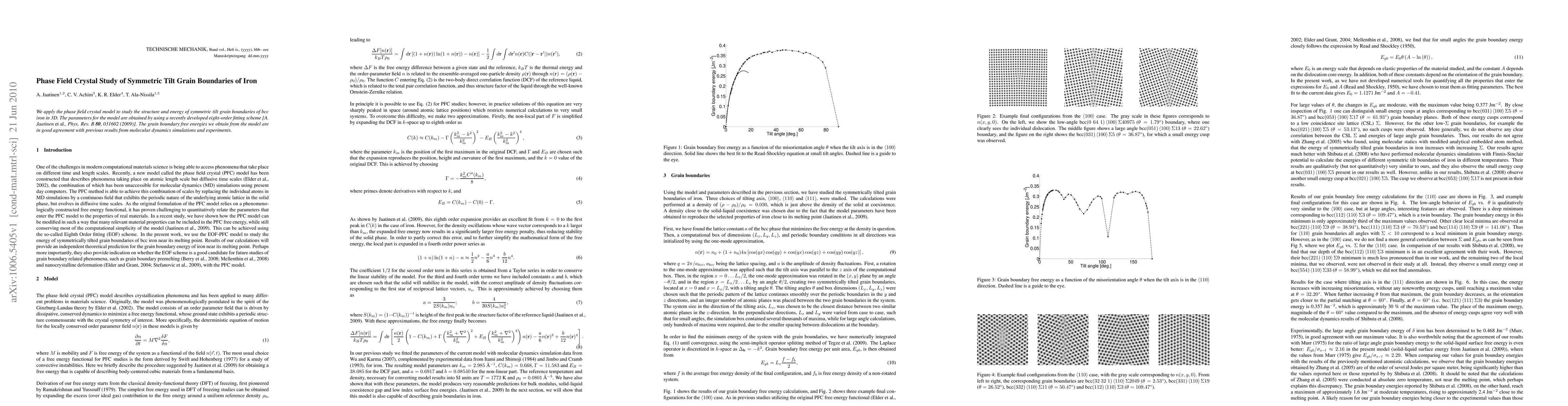 This paper uses the phase field crystal model to investigate the structure and energy of symmetric tilt grain boundaries in bcc iron, achieving results that align well with prior molecular dynamics simulations and experimental data. The model parameters are derived from an eight-order fitting scheme.
