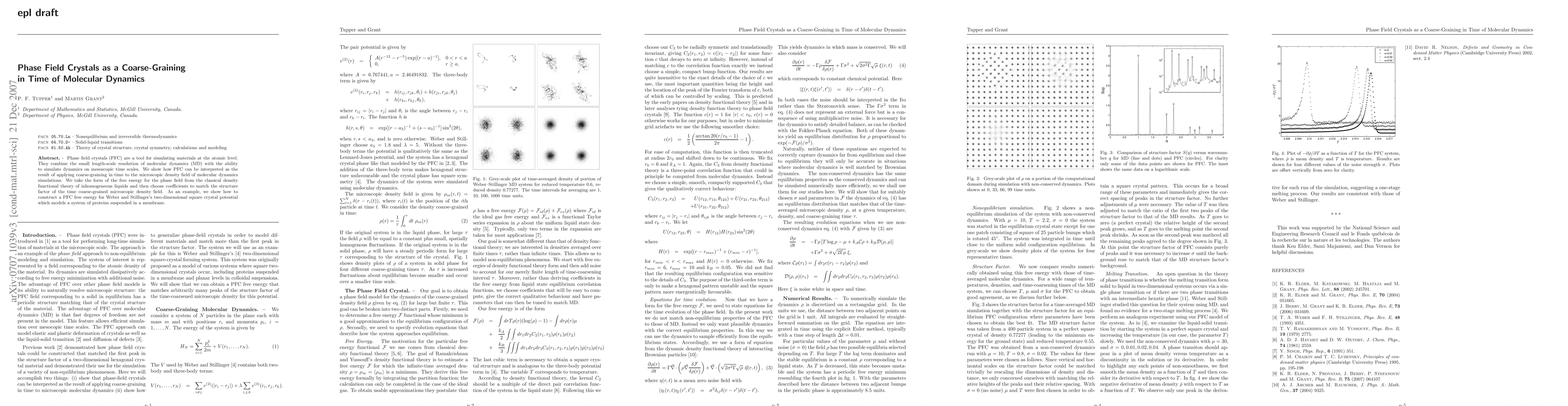 This paper demonstrates that phase field crystals (PFC) can simulate materials at the atomic level by combining the resolution of molecular dynamics with mesoscopic time scales, achieved through coarse-graining in time. The authors derive a PFC free energy from classical density functional theory and match it to the structure factor of the coarse-grained microscopic density field, exemplified by a two-dimensional square crystal potential for protein systems.