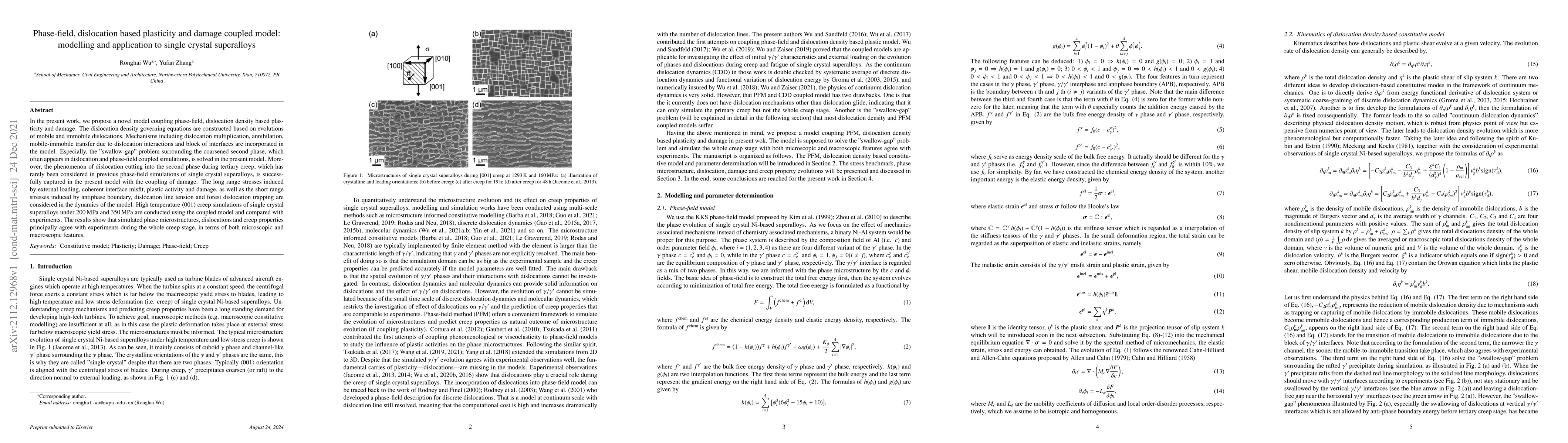 This paper proposes a novel coupled model integrating phase-field, dislocation density-based plasticity, and damage to simulate the behavior of single crystal superalloys under high-temperature creep. The model successfully addresses the "swallow-gap" problem and captures dislocation cutting into second phases, showing good agreement with experimental results.