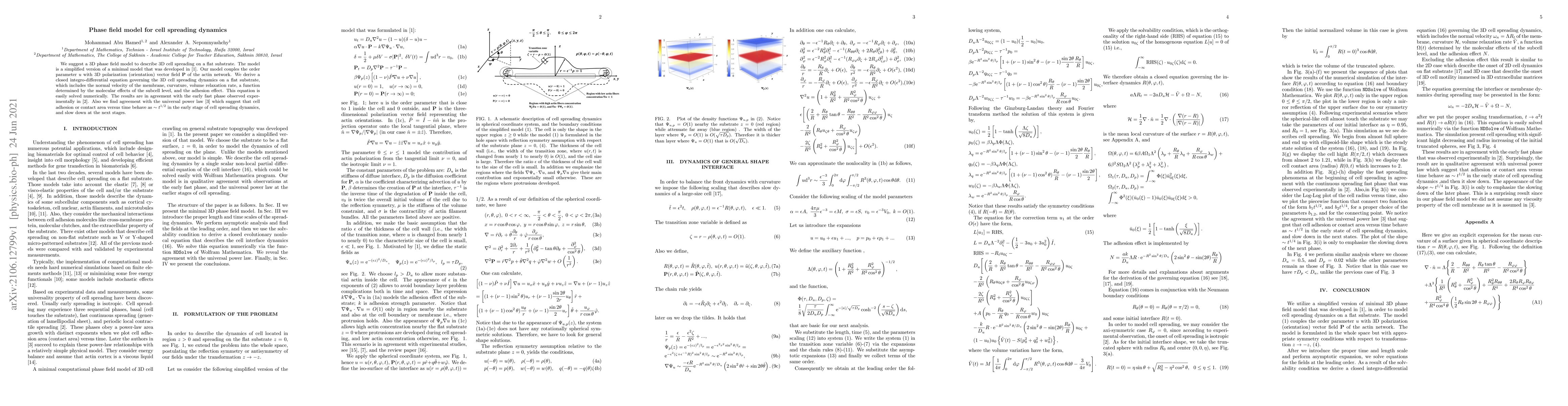 We suggest a 3D phase field model to describe 3D cell spreading on a flat substrate. The model is a simplified version of a minimal model that was developed in [1]. Our model couples the order parameter $u$ with 3D polarization (orientation) vector field $\textbf{P}$ of the actin network. We derive a closed integro-differential equation governing the 3D cell spreading dynamics on a flat substrate, which includes the normal velocity of the membrane, curvature, volume relaxation rate, a function determined by the molecular effects of the subcell level, and the adhesion effect. This equation is easily solved numerically. The results are in agreement with the early fast phase observed experimentally in [2]. Also we find agreement with the universal power law [3] which suggest that cell adhesion or contact area versus time behave as $\sim t^{1/2}$ in the early stage of cell spreading dynamics, and slow down at the next stages.