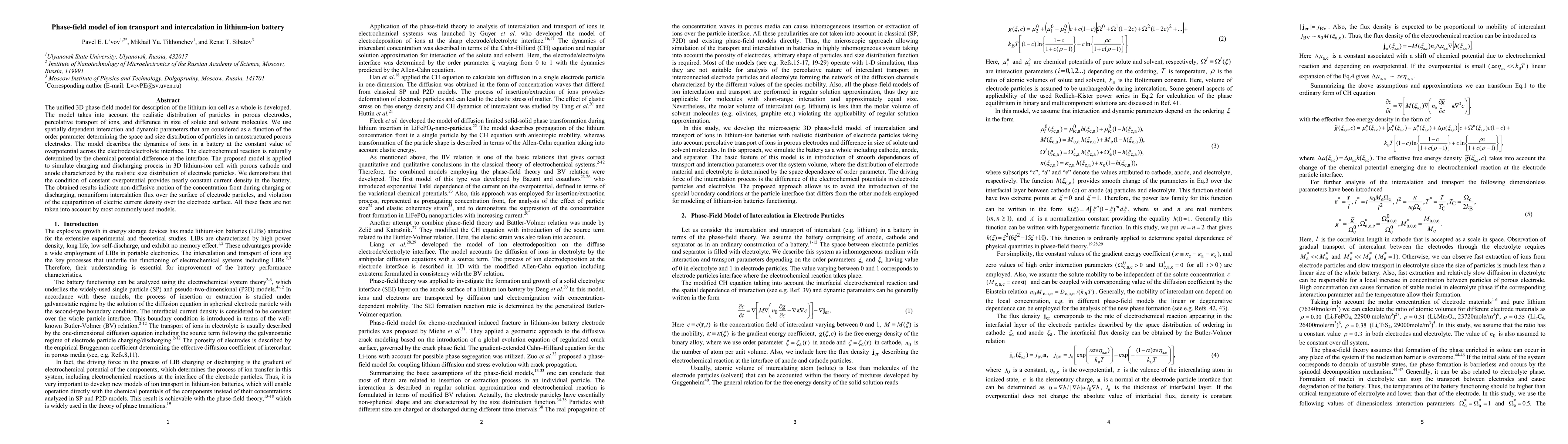 The unified 3D phase-field model for the description of the lithium-ion cell as a whole is developed. The model takes into account the realistic distribution of particles in porous electrodes, percolative transport of ions, and the difference in size of solute and solvent molecules. We use spatially dependent interaction and dynamic parameters that are considered as a function of the order parameter determining the space and size distribution of particles in nanostructured porous electrodes. The model describes the dynamics of ions in a battery at the constant value of overpotential across the electrode/electrolyte interface. The electrochemical reaction is naturally determined by the chemical potential difference at the interface. The proposed model is applied to simulate charging and discharging process in 3D lithium-ion cell with porous cathode and anode characterized by the realistic size distribution of electrode particles. We demonstrate that the condition of constant overpotential provides nearly constant current density in the battery. The obtained results indicate non-diffusive motion of the concentration front during charging or discharging, nonuniform intercalation flux over the surface of electrode particles, and violation of the equipartition of electric current density over the electrode surface. All these facts are not taken into account by the most commonly used models.