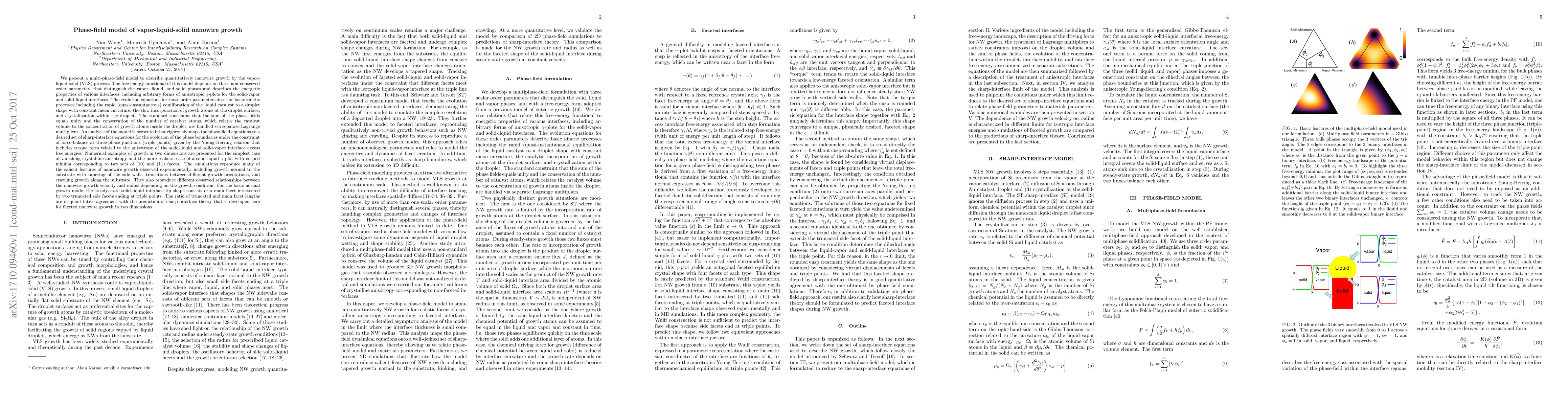 This research develops a multi-phase-field model to quantitatively describe vapor-liquid-solid (VLS) nanowire growth, incorporating kinetic processes and phase interactions, and successfully simulates experimental features like orientation transitions and substrate crawling. The model maps to sharp-interface equations with force-balance constraints at three-phase junctions.
