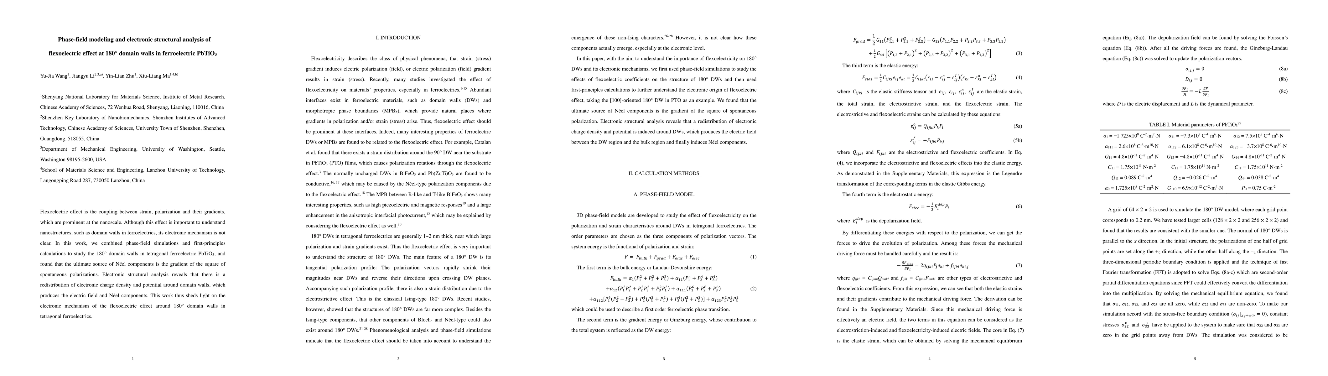 This paper combines phase-field modeling and electronic structure analysis to investigate the flexoelectric effect at 180° domain walls in ferroelectric PbTiO3, revealing the redistribution of electronic charge density and the origin of Néel components due to the gradient of spontaneous polarizations.