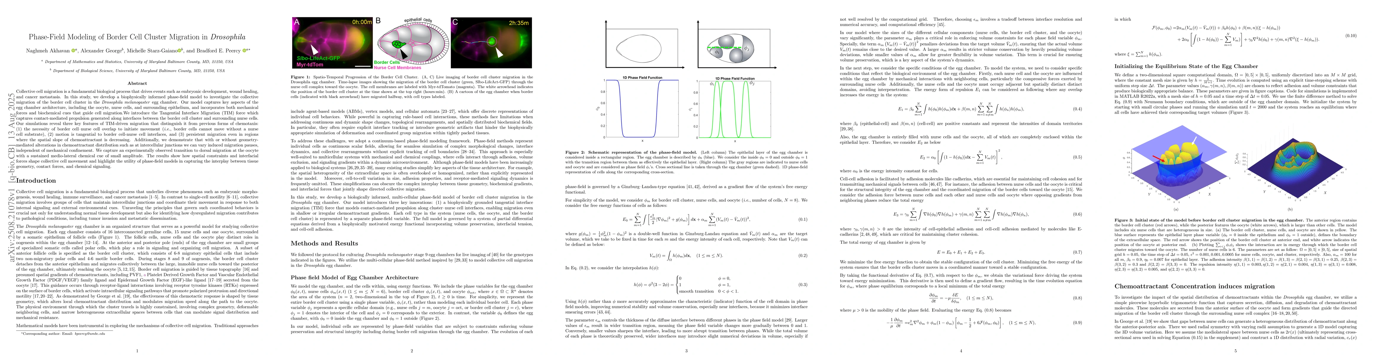 Collective cell migration is a fundamental biological process that drives events such as embryonic development, wound healing, and cancer metastasis. In this study, we develop a biophysically informed phase-field model to investigate the collective migration of the border cell cluster in the Drosophila melanogaster egg chamber. Our model captures key aspects of the egg chamber architecture, including the oocyte, nurse cells, and surrounding epithelium, and incorporates both mechanical forces and biochemical cues that guide cell migration. We introduce the Tangential Interface Migration (TIM) force which captures contact-mediated propulsion generated along interfaces between the border cell cluster and surrounding nurse cells. Our simulations reveal three key features of TIM-driven migration that distinguish it from previous forms of chemotaxis: (1) the necessity of border cell-nurse cell overlap to initiate movement (i.e., border cells cannot move without a nurse cell substrate), (2) motion is tangential to border cell-nurse cell interfaces, and (3) persistent migration even in regions where the spatial slope of chemoattractant is decreasing. Additionally, we demonstrate that with or without geometry-mediated alterations in chemoattractant distribution such as at intercellular junctions we can vary induced migration pauses, independent of mechanical confinement. We capture an experimentally observed transition to dorsal migration at the oocyte with a sustained medio-lateral chemical cue of small amplitude. The results show how spatial constraints and interfacial forces shape collective cell movement and highlight the utility of phase-field models in capturing the interplay between tissue geometry, contact forces, and chemical signaling.