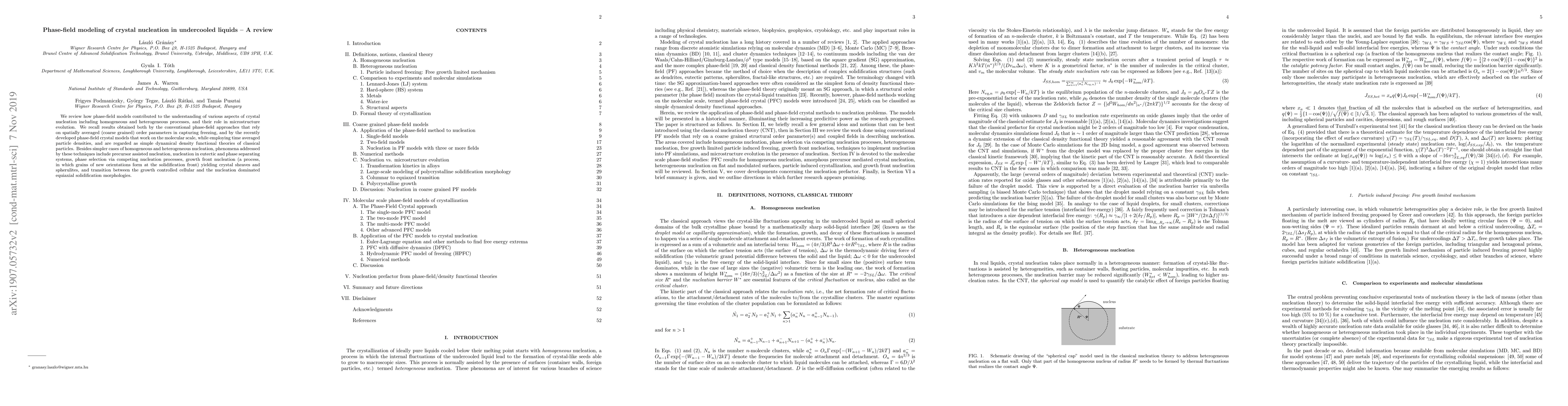 This paper reviews phase-field models' contributions to understanding crystal nucleation in undercooled liquids, covering both homogeneous and heterogeneous processes, and highlighting recent advancements in phase-field crystal models that operate on molecular scales. It discusses phenomena like precursor-assisted nucleation and the transition between different solidification morphologies.