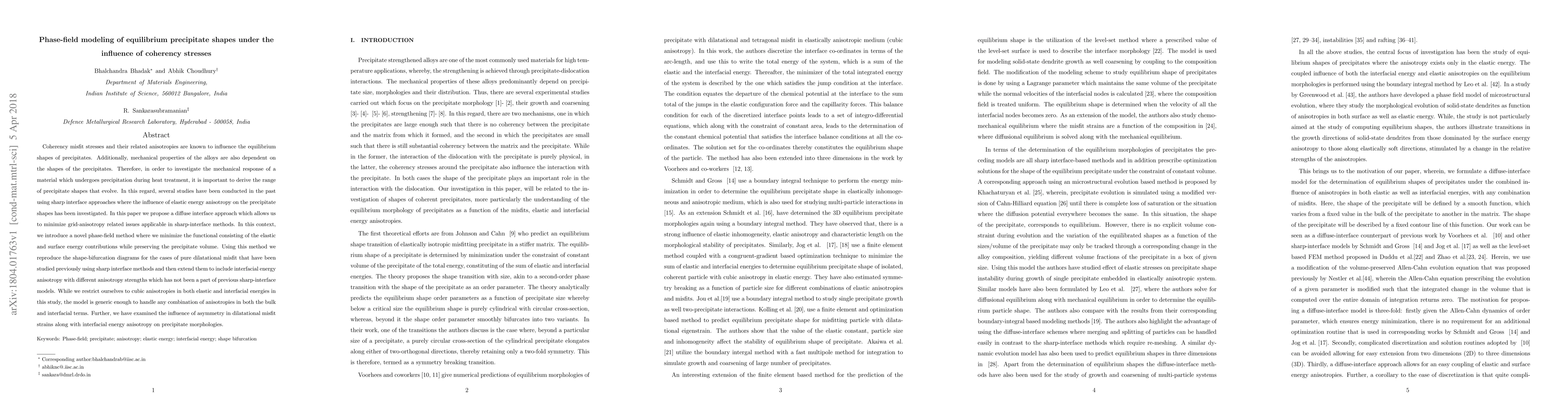 This paper proposes a phase-field method to model equilibrium precipitate shapes influenced by coherency stresses, addressing grid-anisotropy issues in sharp-interface approaches. The method minimizes elastic and surface energy while preserving precipitate volume, extending shape-bifurcation diagrams to include interfacial energy anisotropy and asymmetry in dilatational misfit strains.