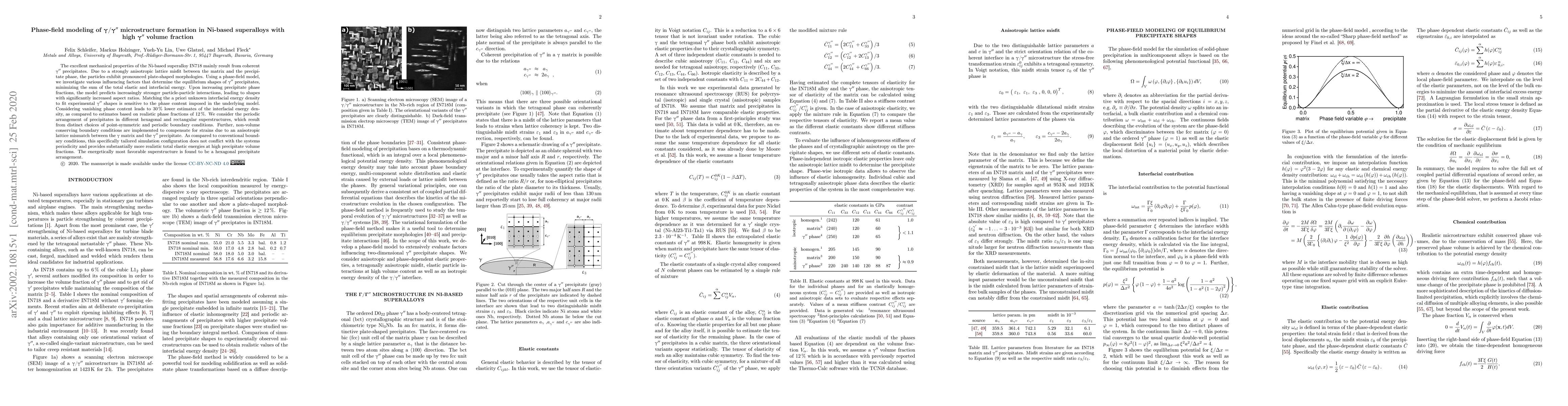 The excellent mechanical properties of the Ni-based superalloy IN718 mainly result from coherent $\gamma''$ precipitates. Due to a strongly anisotropic lattice misfit between the matrix and the precipitate phase, the particles exhibit pronounced plate-shaped morphologies. Using a phase-field model, we investigate various influencing factors that determine the equilibrium shapes of $\gamma"$ precipitates, minimizing the sum of the total elastic and interfacial energy. Upon increasing precipitate phase fractions, the model predicts increasingly stronger particle-particle interactions, leading to shapes with significantly increased aspect ratios. Matching the a priori unknown interfacial energy density to fit experimental $\gamma"$ shapes is sensitive to the phase content imposed in the underlying model. Considering vanishing phase content leads to 30% lower estimates of the interfacial energy density, as compared to estimates based on realistic phase fractions of 12%. We consider the periodic arrangement of precipitates in different hexagonal and rectangular superstructures, which result from distinct choices of point-symmetric and periodic boundary conditions. Further, non-volume conserving boundary conditions are implemented to compensate for strains due to an anisotropic lattice mismatch between the $\gamma$ matrix and the $\gamma''$ precipitate. As compared to conventional boundary conditions, this specifically tailored simulation configuration does not conflict with the systems periodicity and provides substantially more realistic total elastic energies at high precipitate volume fractions. The energetically most favorable superstructure is found to be a hexagonal precipitate arrangement.